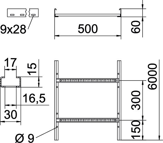 Description du produitÉchelle à câbles d'une hauteur latérale de 60 mm avec échelons soudés à profilé C30 ouvert vers le haut. Longeron latéral enroulé pour le renforcement et la protection des bords. La fixation sur console s'effectue avec des pièces de serrage de type LKS 40. La fente de l'échelon mesure 16,5 mm. La bride de fixation correspondante est de type 2056.