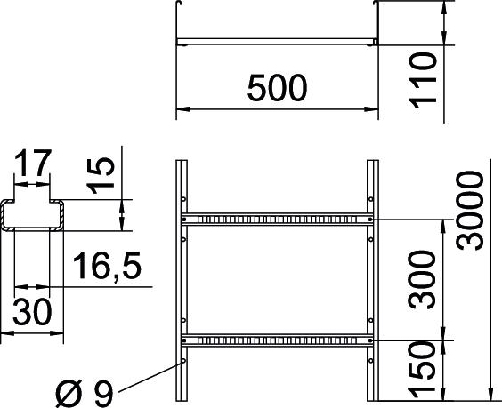 Description du produitEchelle à câbles avec longeron latéral perforé d'une hauteur d'aile de 110 mm, avec échelons rivetés (profilé en C) ouverts vers le haut.