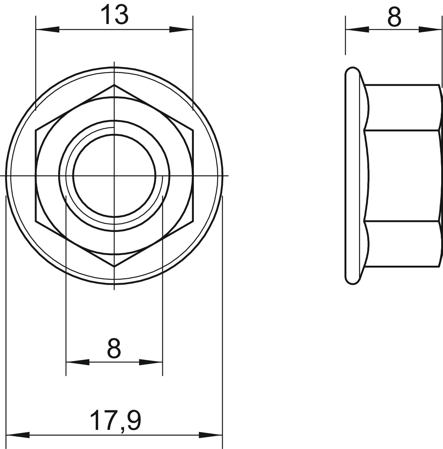 Autobloquant non Avec bride oui Cote d 17,9 mm Dimension M8 Dimension h 8 mm Empreinte CO2 (GWP) du berceau à la porte 0,0386 kg CO2e / 1 Pièce Filet impérial 3/8 pouce Filetage M8 Filetage gauche Non Filetage, métrique 8 Matériau Acier inoxydable Méplat 13 Modèle écrou Écrou Sans halogène oui Surface nu, traité Système à visser écrou Six pans extérieur Type de filetage métrique - Tous les types