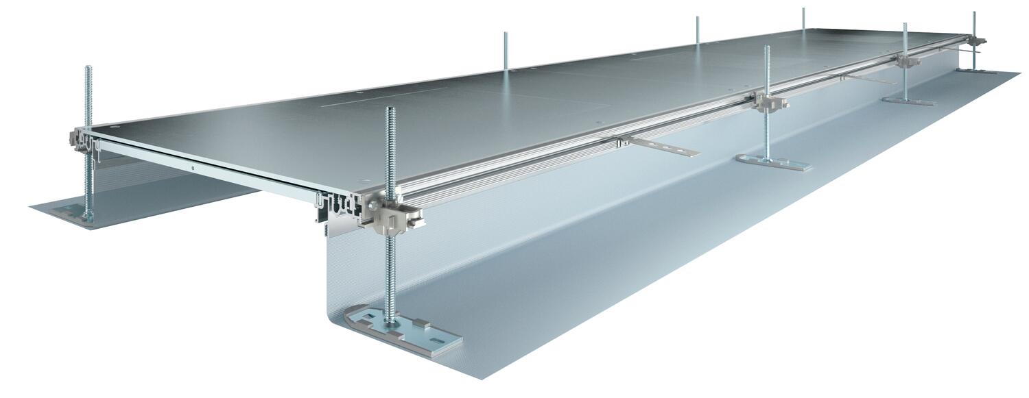 Description du produitÉlément de goulotte affleurant prêt à monter pour l’installation de câbles, composé de 3 couvercles, de deux profilés latéraux avec paroi latérale en tissu métallique, de profilés d’insertion de revêtement de sol de dimension H = 3 mm. Pour locaux secs à l’intérieur avec sols nettoyés à sec. Avec accessoires système correspondants également pour les sols nettoyés à l’eau. 6 équerres de fixation réglables en hauteur, 6 pattes d'ancrage pour béton et 3 embouts d'étanchéité de couvercle pour largeurs nominales de goulotte 200 et 300 ou 400 ou 6 supports de contact de couvercle pour largeurs nominales de goulottes 500 et 600 sont fournis. Les pieds de nivellement obligatoirement nécessaires (veuillez respecter la hauteur de nivellement) pour les supports de contact de couvercle 400, 500 et 600 ne sont pas fournis à la livraison et doivent être commandés séparément. À la livraison, les couvercles de goulotte sont vissés.