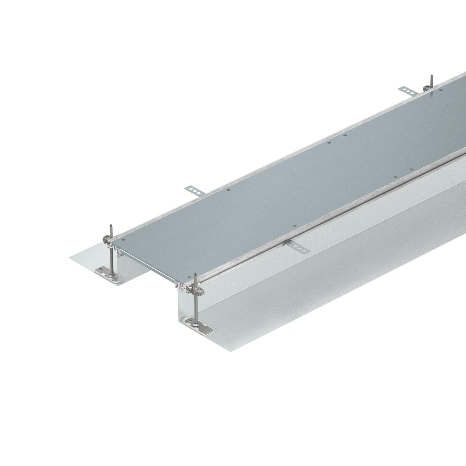 Description du produitÉlément de goulotte prêt à monter pour l’installation de câbles, composé de 3 couvercles pleins, de deux profilés latéraux avec paroi latérale flexible en tissu métallique, de profilés d’insertion de revêtement de sol de dimension H = 3 mm. 6 équerres de fixation réglables en hauteur, 6 pattes d'ancrage pour béton et 3 embouts d'étanchéité de couvercle pour largeurs nominales de goulotte 200 et 300 ou 400 ou 6 supports de contact de couvercle pour largeurs nominales de goulottes 500 et 600 sont fournis. Les pieds de nivellement obligatoirement nécessaires (veuillez respecter la hauteur de nivellement) pour les supports de contact de couvercle 400, 500 et 600 ne sont pas fournis à la livraison et doivent être commandés séparément. À la livraison, les couvercles de goulotte sont vissés.