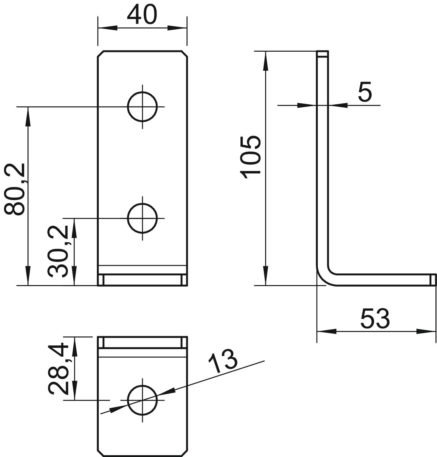 Acier inoxydable, teint non Avec accessoires pour vis non Convient pour formes de profilé Profilé en C Dimension 105x53x40x5 Dimension du trou 13 mm Empreinte CO2 (GWP) du berceau à la porte 0,5041 kg CO2e / 1 Pièce Épaisseur du matériau 5 mm Hauteur 53 mm Largeur 40 mm Longueur 105 mm Matériau Acier Modèle Équerre à 90° Surface galvanisé à chaud par trempage - Tous les types