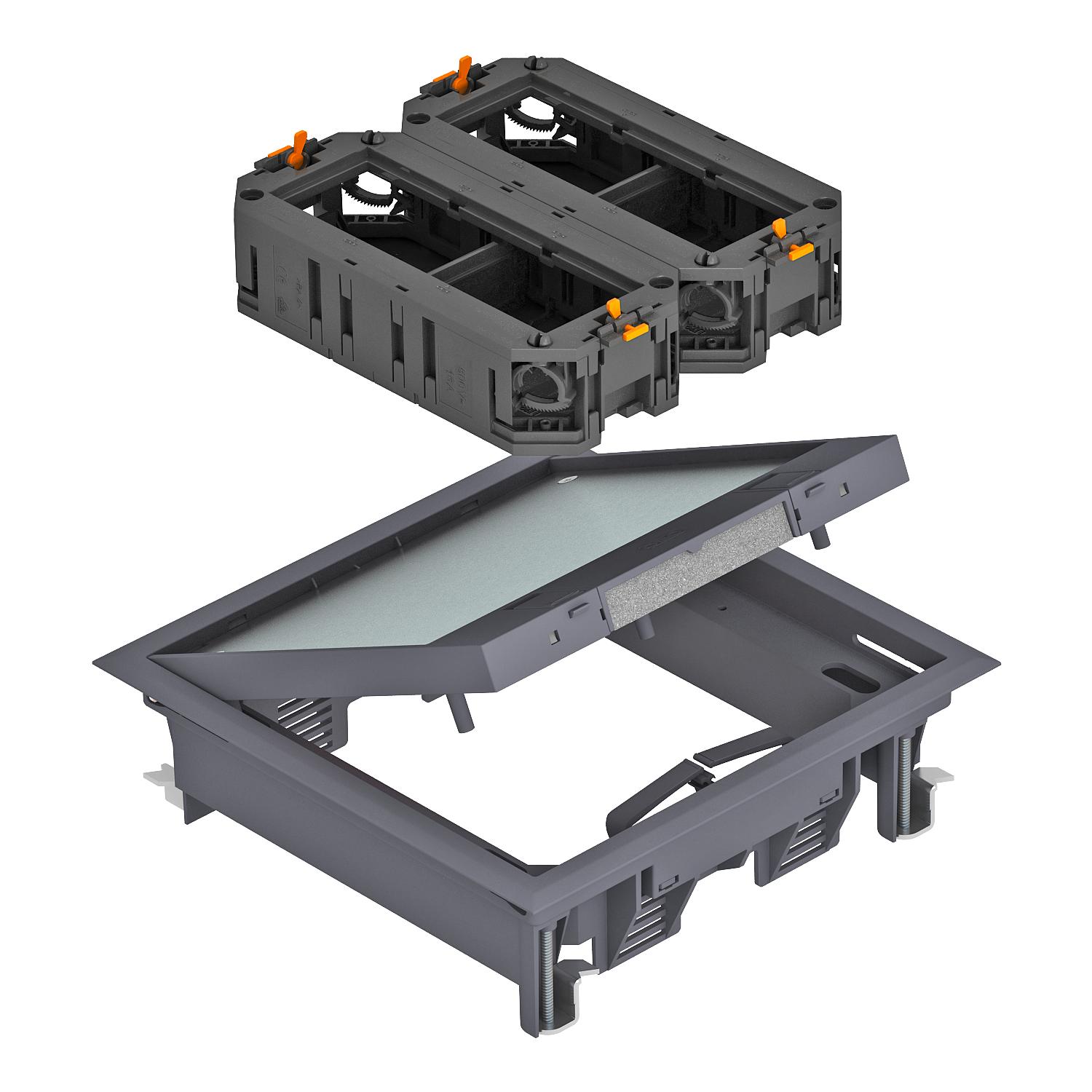 Un boîtier de sol de taille nominale 4 avec équerre de fixation universelle et deux supports universels pour 3 appareillages encastrables Modul 45® chacun sont fournis à la livraison.
