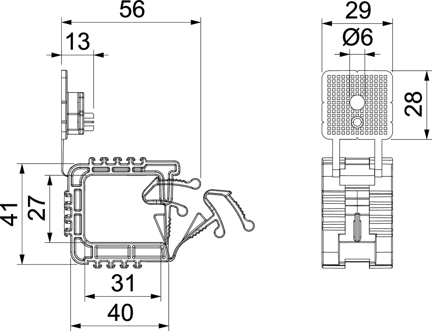 Description du produitPasse-câbles avec trous de fixation Ø 6 mm pour le montage des câbles d'installation, convient pour le montage au mur et plafond. Le tampon de fixation moulé par injection peut être fixé à l'aide de chevilles à frapper ou d'une machine à clouter. La distance de fixation recommandée à équipement complet est de 50 - 60 cm.