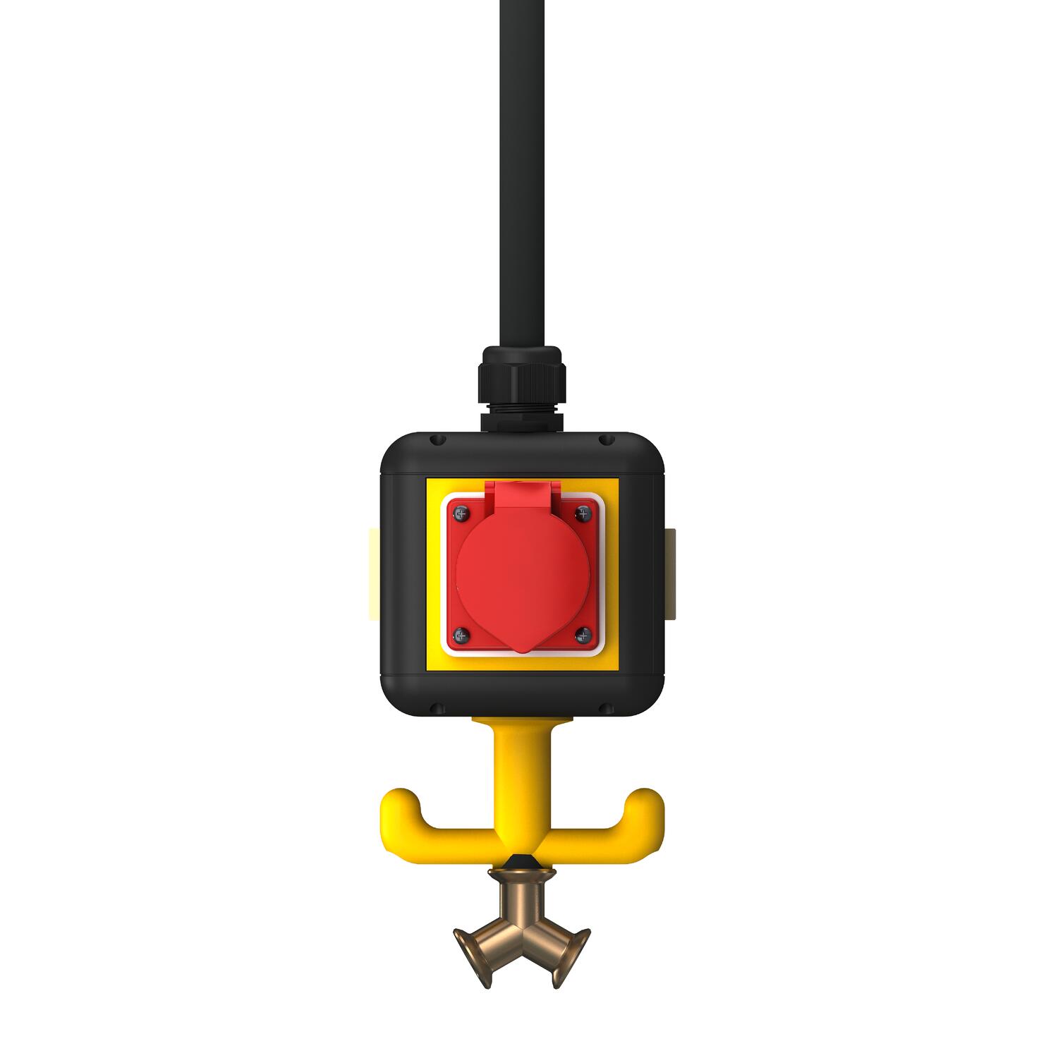 3 prises simples avec fiche de terre 16 A/250 V avec protection accrue contre le contact, précâblé sur un circuit alternatif, raccordement via 1 borne 3 pôles, 1 prise CEE 16 A/415 V, avec cloison de séparation des circuits électriques.