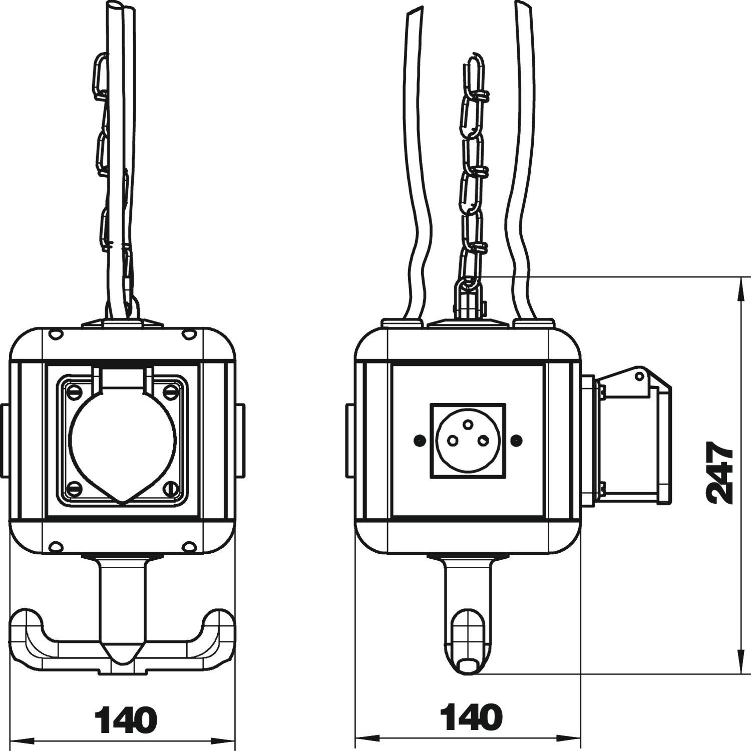3 prises simples avec fiche de terre 16 A/250 V avec protection accrue contre le contact, précâblé sur un circuit alternatif, raccordement via 1 borne 3 pôles, 1 prise CEE 16 A/415 V, avec cloison de séparation des circuits électriques.