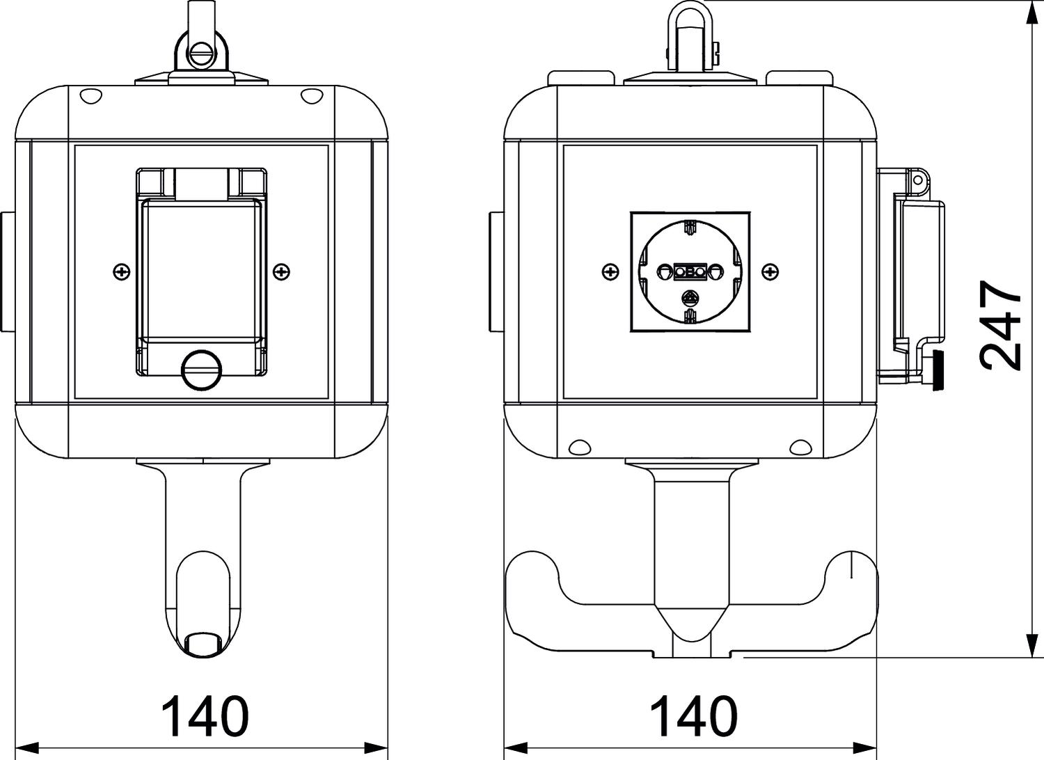 2 prises simples 16 A/250 V avec protection renforcée contre les contacts, précablés sur un circuit alternatif, raccordement via une borne 3 pôles, avec cloison de séparation des circuits électriques et disjoncteur différentiel. Une face non équipée avec une zone libre pour l’équipement individuel (par exemple plaque borgne, plaque de recouvrement pour appareillages encastrables/modules 45).