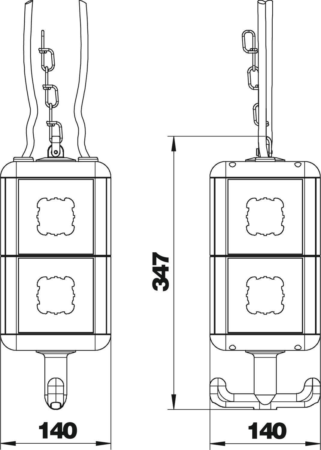 Description du produitBoîtier vide avec oeillets de suspension et poignée crochet, pour montage de 8 instruments électriques, avec cloison de séparation jointe. Avec 8 plaques de recouvrement pour appareillages avec bague de support ou bride support.