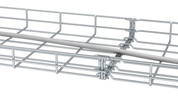 Des composants tels que les coudes, supports latéraux, plaques de montage, raccords rapides et éléments de serrage viennent compléter le système facile à monter. Le couvercle se fixe aisément en plaçant la pince de couvercle type DKU sur le fil transversal du chemin de câble en treillis.