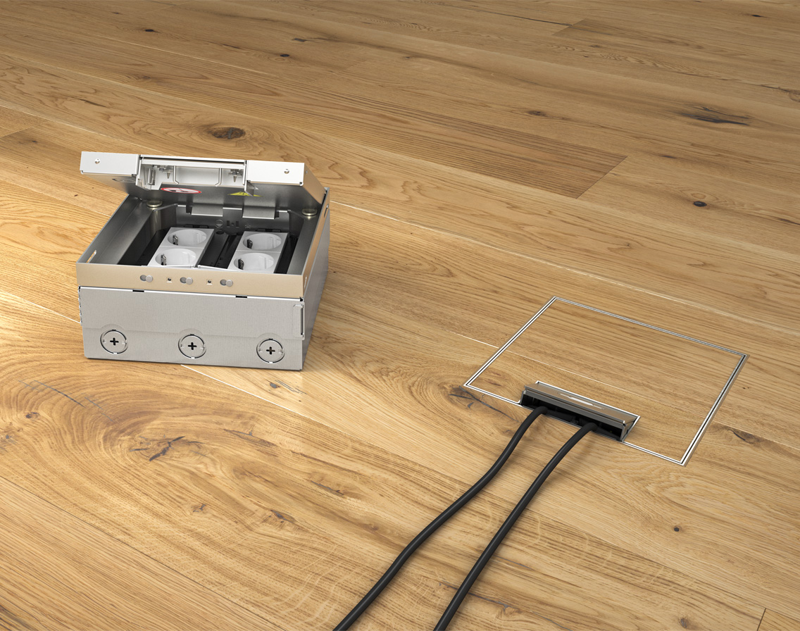 Avec une plage de nivellement allant jusqu’à 30 mm, l’UDHOME4 peut être réglé en toute simplicité au niveau du plancher fini. Le boîtier de sol se montre également flexible lors de l’installation des appareillages : en toute flexibilité, il peut être équipé de 4 appareillages à anneau porteur ou 6 appareillages encastrables Module 45® avec câbles électriques, de données et de multimédia.