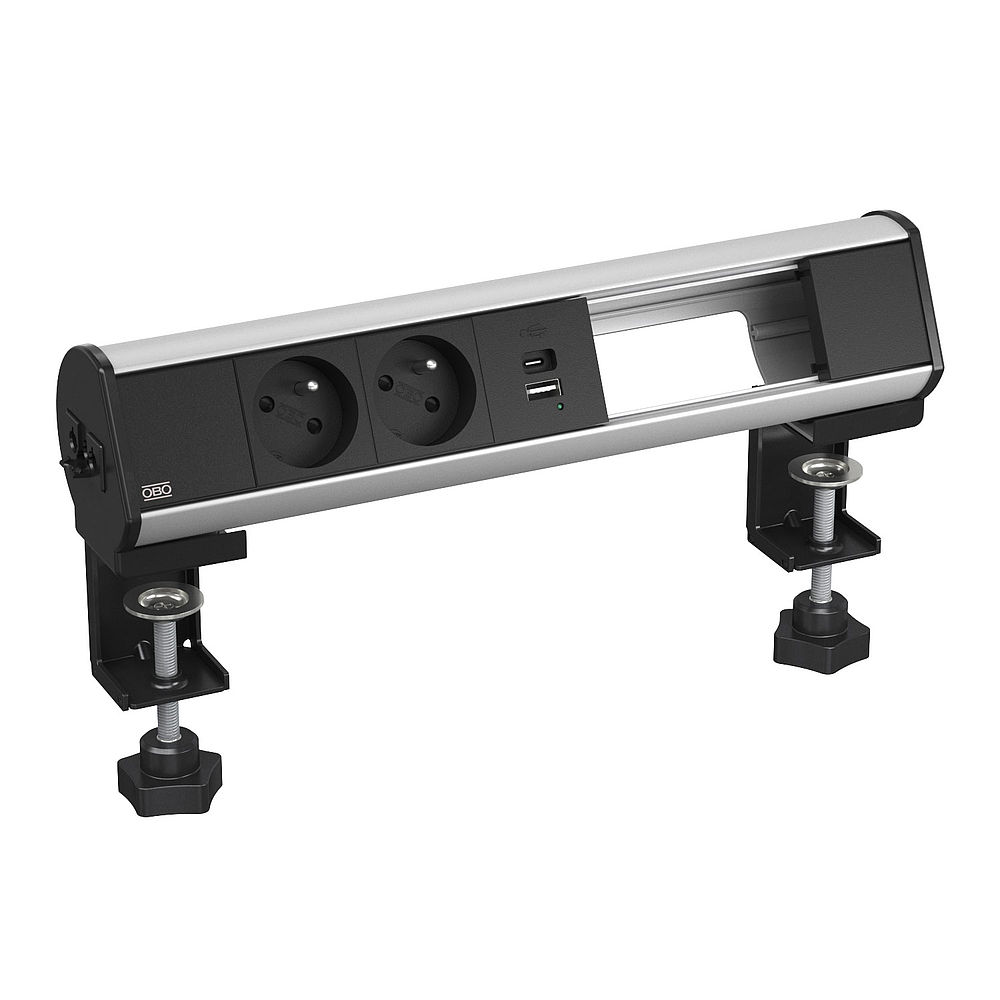 L’installation du Deskbox DBL est particulièrement simple. Son système enfichable avec le câble de raccordement permet également la combinaison avec les distributeurs d’énergie. Comme OBO s’efforce toujours d’offrir la meilleure solution personnalisée possible à ses clients, les variantes du Deskbox pour bureau sont également disponibles avec le système enfichable WAGO. Boîtier complet ou vide à composer, avec montage direct à clipser avec les appareillages Module 45® NF Le bloc multiprises de bureau DBL peut être composé facilement grâce au montage direct à clipser avec les appareillages Module 45® propre à OBO. Il est possible de choisir entre les variantes avec Schuko, chargeur USB et raccord multimédia supplémentaire. Les versions multimédia prééquipées de la prise de bureau pour l’espace de travail disposent d’une grande ouverture sur la partie arrière, sur laquelle il est possible d’introduire facilement les câbles multimédia sans décharge de traction.