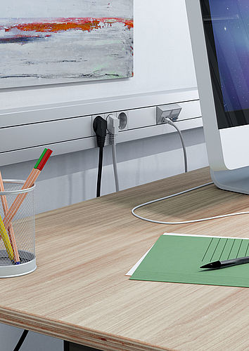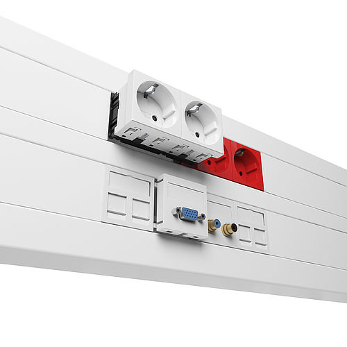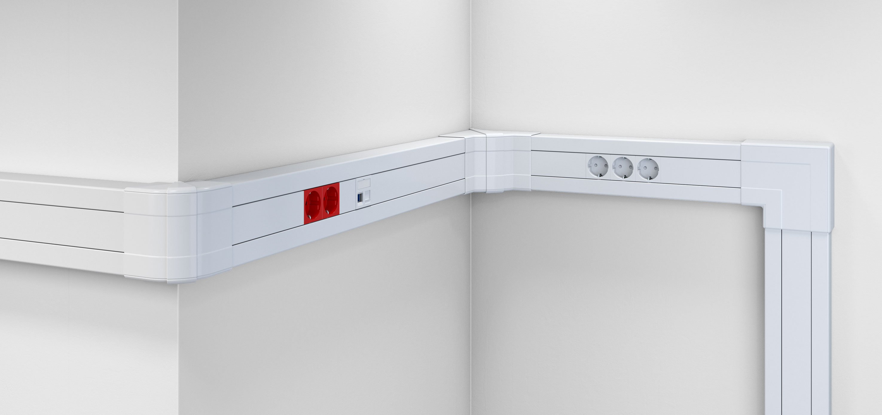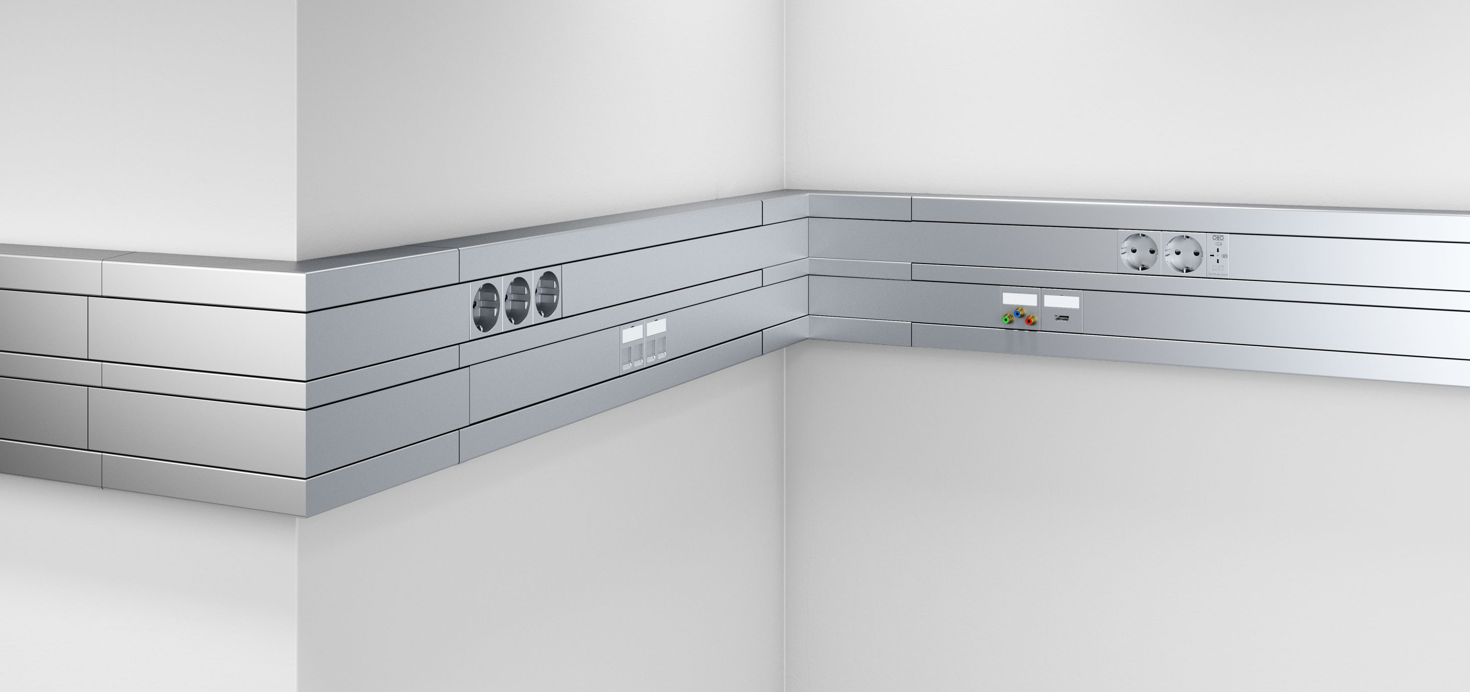 Avec ses pièces de forme innovantes, elle permet une installation murale pratique partout, que ce soit dans des bureaux, des services administratifs ou l’industrie. Le goulotte d'appareillages allie symétrie, homogénéité des couleurs et flexibilité technique en un seul système.