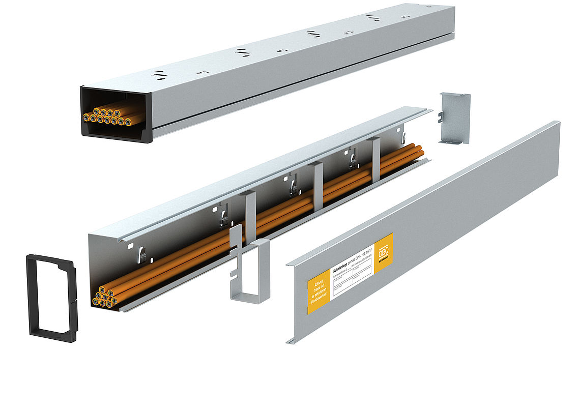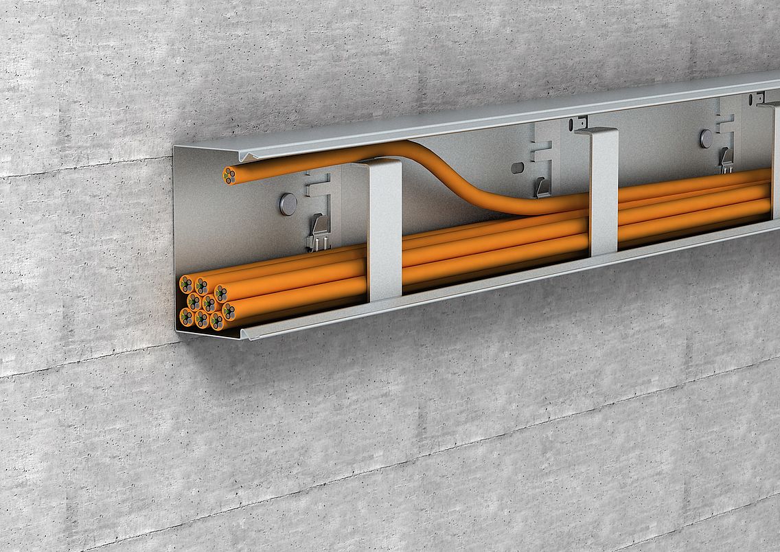 Les goulottes de distribution LKM font leurs preuves aussi bien pour le guidage et la protection de câbles et de conduits qu’à des fins de maintien du fonctionnement. La pose de câbles avec des goulottes de distribution LKM en métal est autorisée en tant que structure porteuse spécifique aux câbles selon la norme DIN 4102 partie 12 pour les classes de maintien du fonctionnement E30 à E90. La goulotte LKM20030 est testée spécialement pour les câbles de télécommunication et de détection d’incendie. La goulotte LKM60100 est testée pour les câbles de puissance ainsi que pour les câbles de télécommunication et de détection d’incendie.
