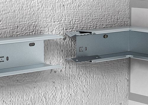 - Le raccord couvre-joint s’enclenche après montage à l’intérieur des goulottes LKM dans les pièces à relier, ce qui permet d’assurer aussi la liaison équipotentielle entre ces deux pièces.
