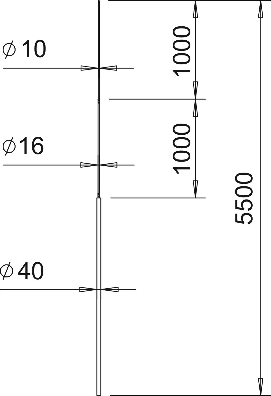 Cote B 3000 mm Cote D 1500 mm Diamètre 40 mm Dimension 5500mm Dimension H 1000 mm Dimension nominale Ø 40/ 16/ 10 mm Longueur 5500 mm Matériau Aluminium Modèle Tige de captage avec trépied Modèle isolé haute tension non - Tous les types