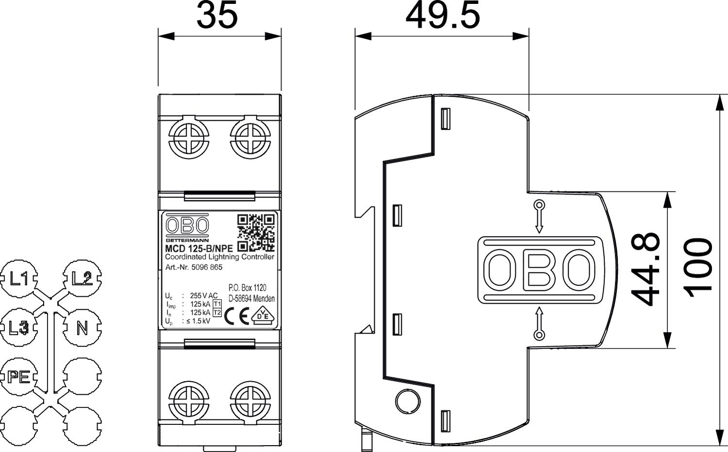 MCD 125-B / NPE: éclateur N-PE coordonné type 1 + 2 selon EN 61643-11. Pour interface 0 à 2 (ZPF) conformément au concept des zones de protection contre la foudre selon CEI 61312-1 ou VDE 0185-305.