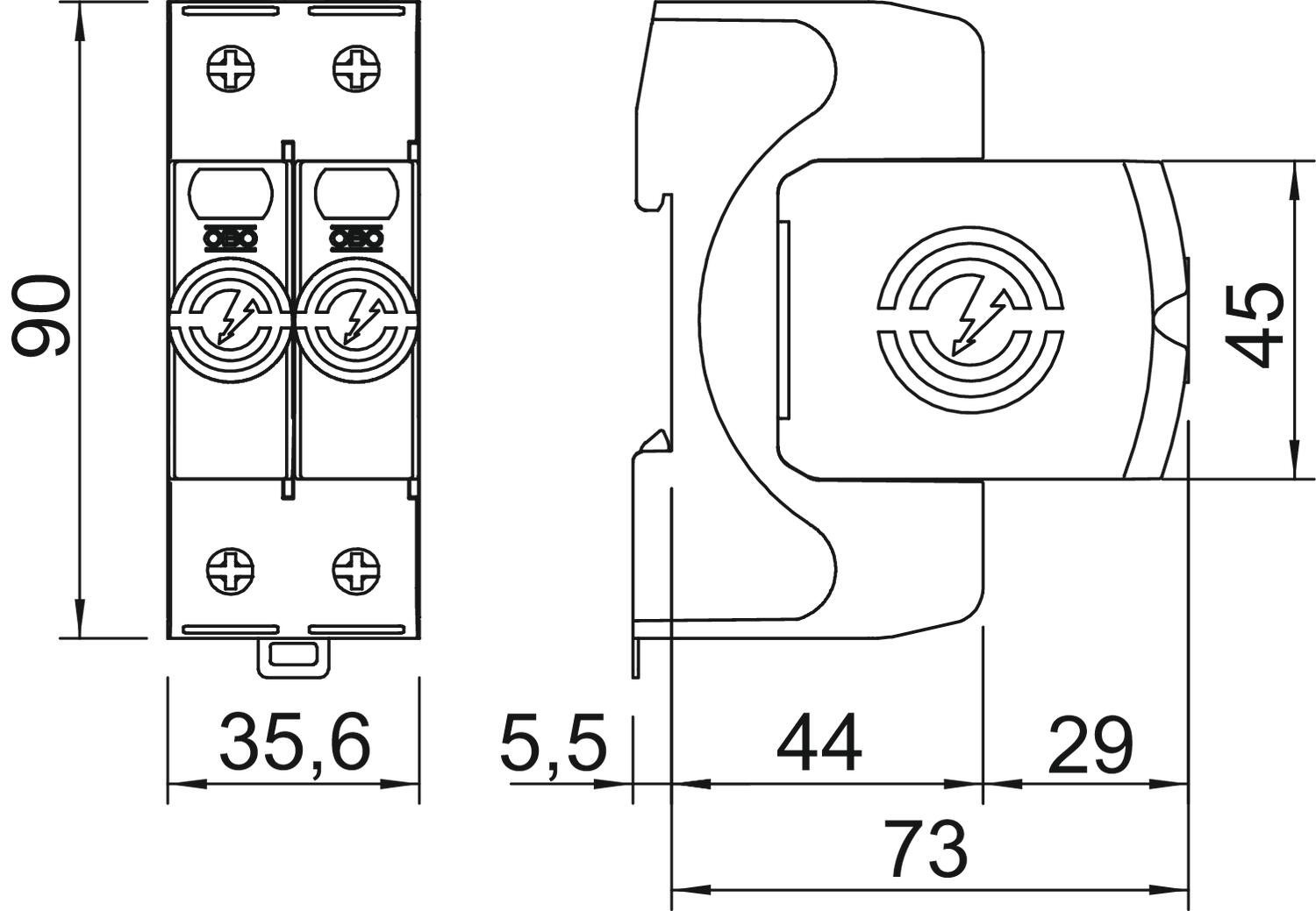 Description du produitParafoudre type 2 • Pour la liaison équipotentielle de protection contre les surtensions selon NF C 15 100 (IEC 60364-4-44) • Capacité d'écoulement jusqu'à 40 kA (8/20) par pôle grâce à des varistances haute performance • Parafoudre modulaire débrochable avec dispositif de coupure dynamique et voyant d'état • Mécanisme de verrouillage avec protection contre les vibrations et codage de tension • Plastique retardateur de la flamme selon UL 94 V-0 • Les variantes FS possèdent un contact inverseur libre de potentiel pour le report d'alarme Application : liaison équipotentielle dans les tableaux généraux et divisionnaires.