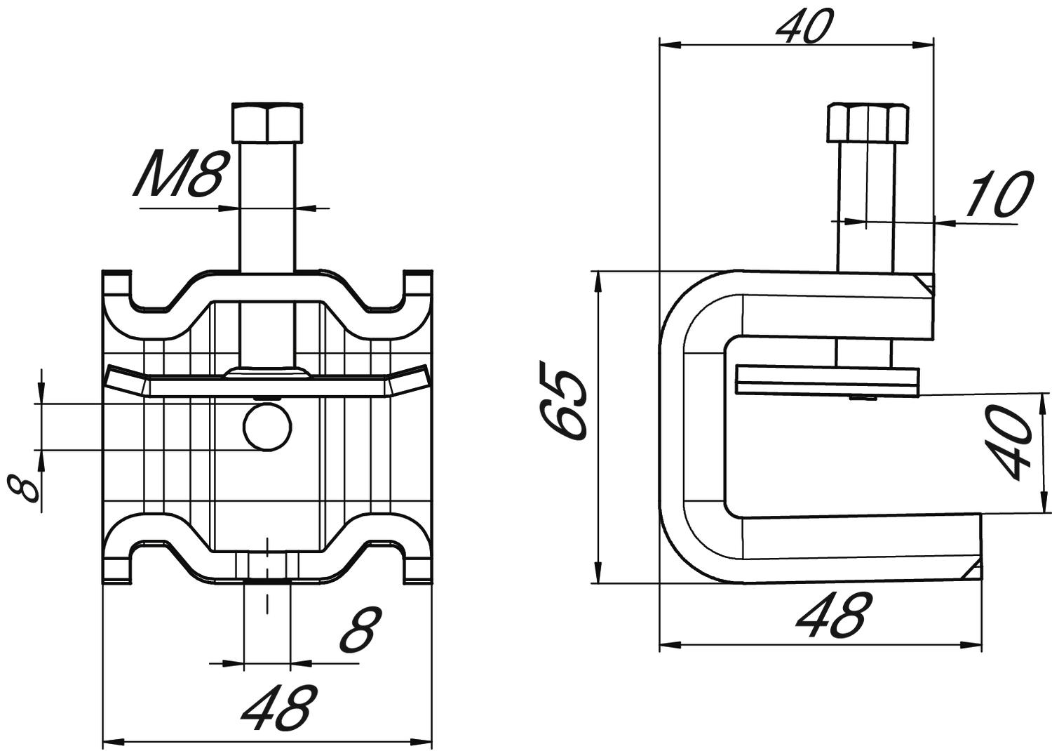 Description du produitCe type de pince de fixation est poussé sur le support et fixé sur le support ou un fer plat au moyen d'un patin de pression et d'une vis (M8). La vis hexagonale est dotée d'une cote sur plat de 10 mm. En outre, dans le corps de bride, deux autres filets M8 sont prévus pour fixer entre autres des tiges filetées.