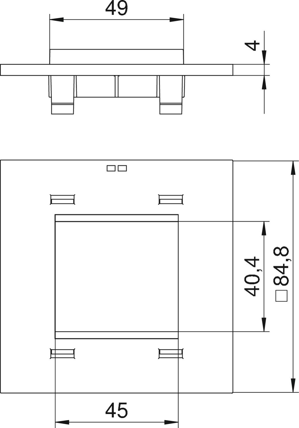 Description du produitPlaque de support d'appareillages avec ouverture carrée pour une prise simple de type Module 45, adaptée aux côtés étroits T4L et T8NL ou aux côtés longitudinaux T4L et T8NL (couvercle 1/2).