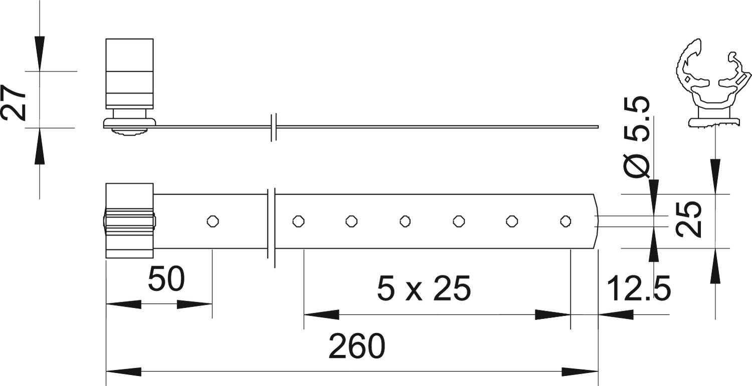 Ajustement Rd 8-10 mm Application Surface de toit Diamètre du conducteur max. 10 Diamètre du conducteur min. 8 Dimension 260mm Empreinte CO2 (GWP) du berceau à la porte 0,3106 kg CO2e / 1 Pièce Hauteur de montage 27 mm Longueur 260 mm Matériau acier inoxydable 1.4301 Type de fixation du conducteur avec collier de serrage Type de montage peut être vissé - Tous les types