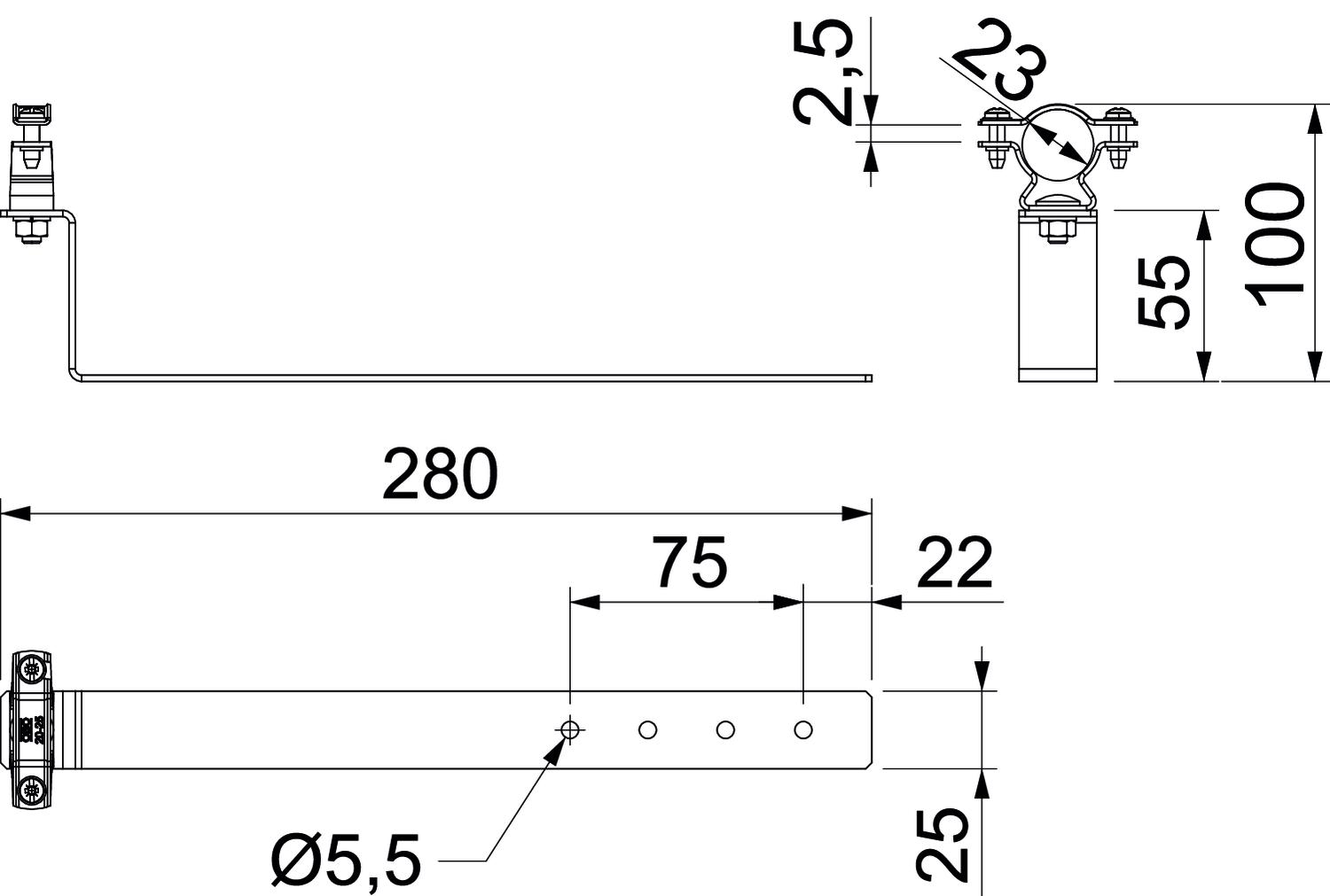 Application Toit en bâtière Cote L 2,5 mm Diamètre du conducteur min. 23 Dimension 280mm Empreinte CO2 (GWP) du berceau à la porte 1,171 kg CO2e / 1 Pièce Hauteur de montage 55 mm Longueur 280 mm Matériau acier inoxydable 1.4301 Raccordement Conducteur rond Type de fixation du conducteur avec collier de serrage Type de montage peut être vissé - Tous les types