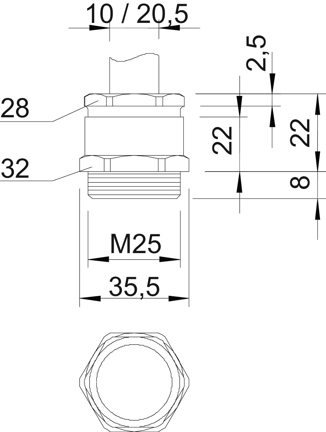 Anti-chocs non Avec contre-écrou non Bague d'étanchéité à usage multiple non Capacité d’étanchéité D max. 20,5 mm Capacité d’étanchéité D min. 10 mm Cote L 22 mm Cote L1 8 mm Cote L2 22 mm Cote L3 2,5 mm Dimension M25 Dimension E 35,5 mm Dimension L max. 22 mm Eclateur antidéflagrant non Empreinte CO2 (GWP) du berceau à la porte 0,1137 kg CO2e / 1 Pièce Filetage M25 x 1,5 Indice de protection IP65 Longueur de filetage 8 mm Matériau laiton Ouverture de clé 1 32 mm Ouverture de clé 2 28 mm Possibilité de décharge de traction non Pour zone explosive sans Presse-étoupe pour câbles plats non Protection antiflexion non Renforcé par fibres de verre non Sans halogène non Surface nickelé Type d'étanchéité bague d’étanchéité découpable Type de filetage métrique - Tous les types