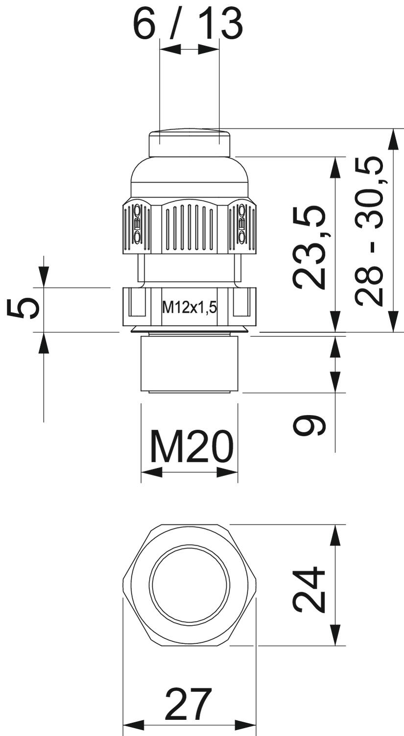 Anti-chocs non Avec contre-écrou non Bague d'étanchéité à usage multiple non Capacité d’étanchéité D max. 13 mm Capacité d’étanchéité D min. 6 mm Cote L1 9 mm Cote L2 5 mm Cote L3 23,5 mm Couleur gris clair; RAL 7035 Couple de serrage instable 3,8 Nm Diamètre nominal du filetage 20 Dimension M20 Dimension E 27 mm Dimension L max. 30,5 mm Dimension L min. 28 mm Eclateur antidéflagrant non Empreinte CO2 (GWP) du berceau à la porte 0,0495 kg CO2e / 1 Pièce Filetage M20 x 1,5 Hauteur 27 mm Indice de protection IP68 Largeur 24 mm Longueur 28 mm Longueur de filetage 10 mm Matériau Polyamide Méplat 24 Modèle droit Ouverture de clé 1 24 mm Pas de filetage 1,5 mm Plage de températures d’utilisation max. 65 °C Plage de températures d’utilisation min. -20 °C Possibilité de décharge de traction oui Pour zone explosive sans Pour zone explosive gaz sans Pour zone explosive poussières sans Presse-étoupe divisible non Presse-étoupe pour câbles plats non Protection antiflexion non Renforcé par fibres de verre non Résistant aux flammes selon la norme VDE 0471/DIN 695 partie 2-1, température de test 650 °C Sans halogène oui Six pans cote sur angulaire 27 mm Type d'étanchéité Bague d'étanchéité Type de filetage métrique - Tous les types