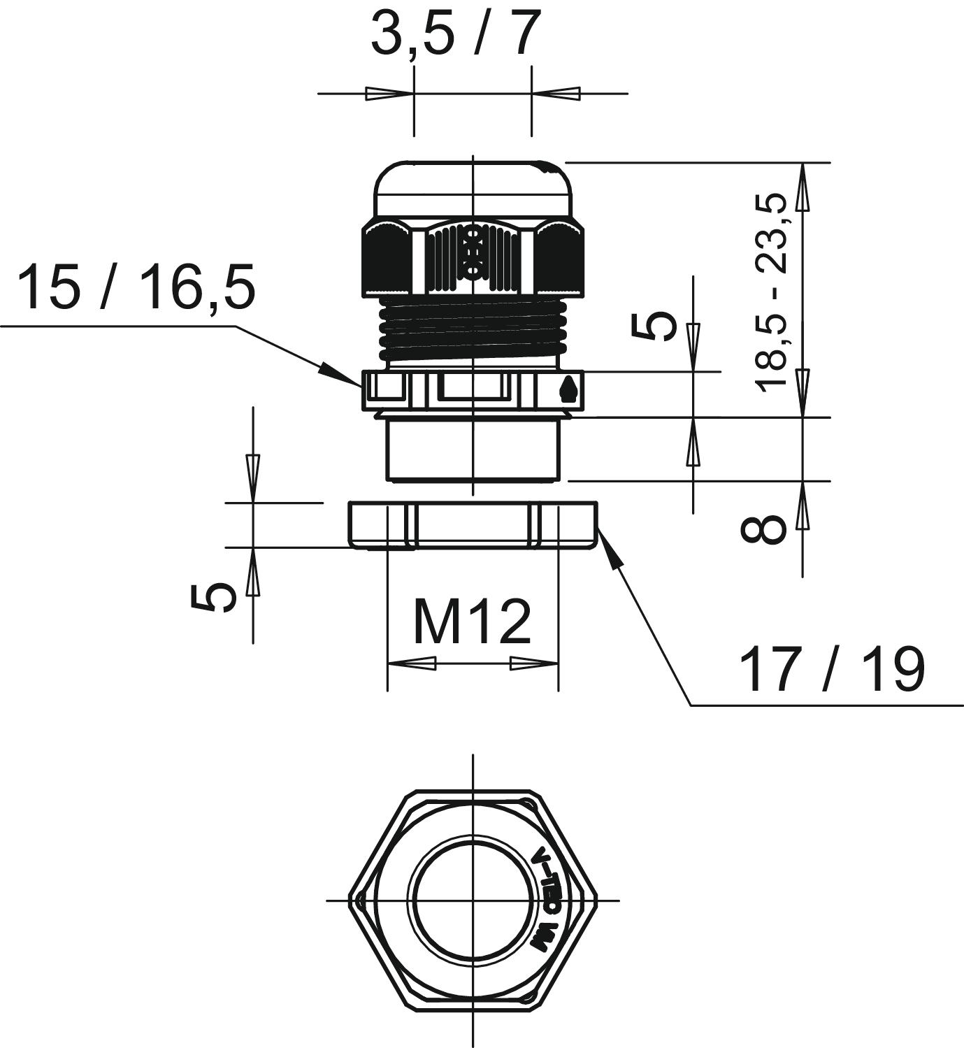 Anti-chocs non Avec contre-écrou non Bague d'étanchéité à usage multiple non Capacité d’étanchéité D max. 7 mm Capacité d’étanchéité D min. 3,5 mm Cote E1 (mm) 16,5 mm Cote E2 19 mm Cote L1 8 mm Cote L2 5 mm Cote L3 5 mm Couleur gris clair; RAL 7035 Couple de serrage instable 2 Nm Diamètre nominal du filetage 12 Dimension M12 Dimension L max. 23,5 mm Dimension L min. 18,5 mm Eclateur antidéflagrant non Empreinte CO2 (GWP) du berceau à la porte 0,0255 kg CO2e / 1 Pièce Filetage M12 x 1,5 Indice de protection IP68 Longueur de filetage 8 mm Matériau Polyamide Modèle droit Ouverture de clé 1 15 mm Ouverture de clé 2 17 mm Pas de filetage 1,5 mm Plage de températures d’utilisation max. 65 °C Plage de températures d’utilisation min. -20 °C Possibilité de décharge de traction oui Pour zone explosive sans Pour zone explosive gaz sans Pour zone explosive poussières sans Presse-étoupe divisible non Presse-étoupe pour câbles plats non Protection antiflexion non Renforcé par fibres de verre non Résistant aux flammes selon la norme VDE 0471/DIN 695 partie 2-1, température de test 650 °C Sans halogène oui Type d'étanchéité Bague d'étanchéité Type de filetage métrique - Tous les types
