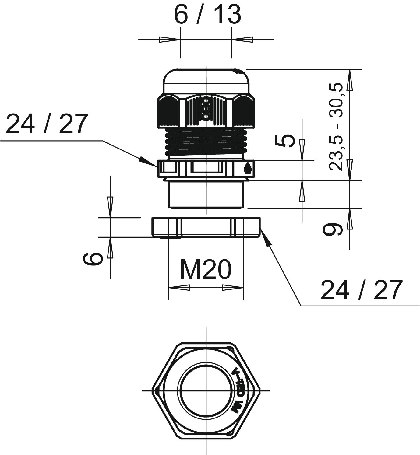 Anti-chocs non Avec contre-écrou non Bague d'étanchéité à usage multiple non Capacité d’étanchéité D max. 13 mm Capacité d’étanchéité D min. 6 mm Cote E1 (mm) 27 mm Cote E2 27 mm Cote L1 9 mm Cote L2 5 mm Cote L3 6 mm Couleur gris clair; RAL 7035 Couple de serrage instable 3,8 Nm Diamètre nominal du filetage 20 Dimension M20 Dimension L max. 30,5 mm Dimension L min. 23,5 mm Eclateur antidéflagrant non Empreinte CO2 (GWP) du berceau à la porte 0,0503 kg CO2e / 1 Pièce Filetage M20 x 1,5 Indice de protection IP68 Longueur de filetage 9 mm Matériau Polyamide Modèle droit Ouverture de clé 1 24 mm Ouverture de clé 2 24 mm Pas de filetage 1,5 mm Plage de températures d’utilisation max. 65 °C Plage de températures d’utilisation min. -20 °C Possibilité de décharge de traction oui Pour zone explosive sans Pour zone explosive gaz sans Pour zone explosive poussières sans Presse-étoupe divisible non Presse-étoupe pour câbles plats non Protection antiflexion non Renforcé par fibres de verre non Résistant aux flammes selon la norme VDE 0471/DIN 695 partie 2-1, température de test 650 °C Sans halogène oui Type d'étanchéité Bague d'étanchéité Type de filetage métrique - Tous les types
