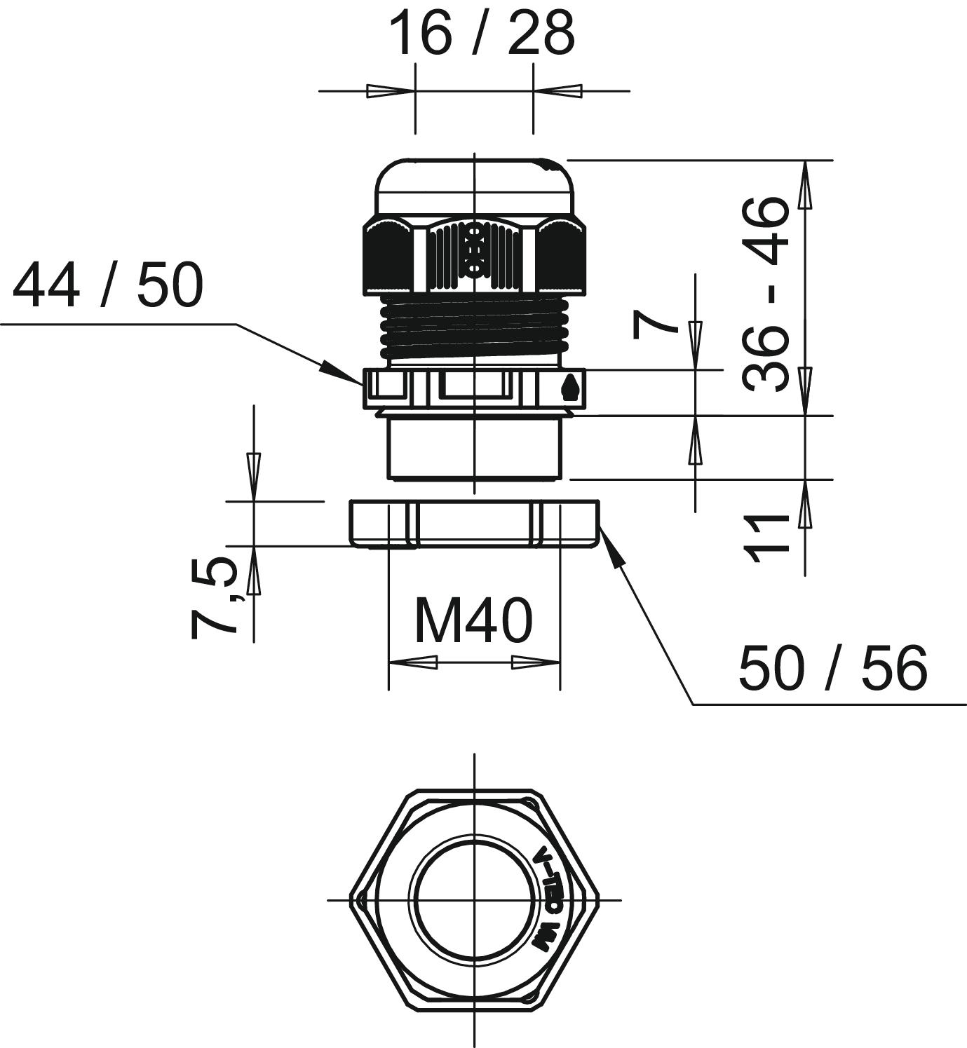 Anti-chocs non Avec contre-écrou non Bague d'étanchéité à usage multiple non Capacité d’étanchéité D max. 28 mm Capacité d’étanchéité D min. 16 mm Cote E1 (mm) 50 mm Cote E2 56 mm Cote L1 11 mm Cote L2 7 mm Cote L3 7,5 mm Couleur gris clair; RAL 7035 Couple de serrage instable 10 Nm Diamètre nominal du filetage 40 Dimension M40 Dimension L max. 46 mm Dimension L min. 36 mm Eclateur antidéflagrant non Empreinte CO2 (GWP) du berceau à la porte 0,204 kg CO2e / 1 Pièce Filetage M40 x 1,5 Indice de protection IP68 Longueur de filetage 11 mm Matériau Polyamide Modèle droit Ouverture de clé 1 44 mm Ouverture de clé 2 50 mm Pas de filetage 1,5 mm Plage de températures d’utilisation max. 65 °C Plage de températures d’utilisation min. -20 °C Possibilité de décharge de traction oui Pour zone explosive sans Pour zone explosive gaz sans Pour zone explosive poussières sans Presse-étoupe divisible non Presse-étoupe pour câbles plats non Protection antiflexion non Renforcé par fibres de verre non Résistant aux flammes selon la norme VDE 0471/DIN 695 partie 2-1, température de test 650 °C Sans halogène oui Type d'étanchéité Bague d'étanchéité Type de filetage métrique - Tous les types