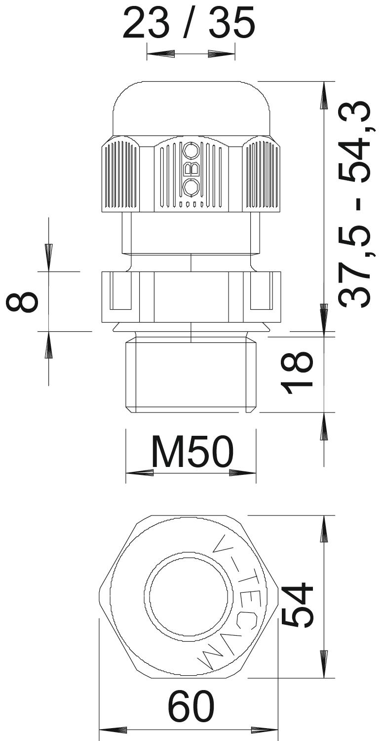 Anti-chocs non Avec contre-écrou non Bague d'étanchéité à usage multiple non Capacité d’étanchéité D max. 35 mm Capacité d’étanchéité D min. 23 mm Cote L1 18 mm Cote L2 8 mm Couleur gris argent; RAL 7001 Couple de serrage instable 12 Nm Diamètre nominal du filetage 50 Dimension M50 Dimension E 60 mm Dimension L max. 54,3 mm Dimension L min. 37,5 mm Eclateur antidéflagrant non Empreinte CO2 (GWP) du berceau à la porte 0,2907 kg CO2e / 1 Pièce Filetage M50 x 1,5 Indice de protection IP68 Longueur de filetage 18 mm Matériau Polyamide Méplat 54 Modèle droit Pas de filetage 1,5 mm Plage de températures d’utilisation max. 65 °C Plage de températures d’utilisation min. -20 °C Possibilité de décharge de traction oui Pour zone explosive sans Pour zone explosive gaz sans Pour zone explosive poussières sans Presse-étoupe divisible non Presse-étoupe pour câbles plats non Protection antiflexion non Renforcé par fibres de verre non Résistant aux flammes selon la norme VDE 0471/DIN 695 partie 2-1, température de test 650 °C Sans halogène oui Six pans cote sur angulaire 60 mm Type d'étanchéité Bague d'étanchéité Type de filetage métrique - Tous les types