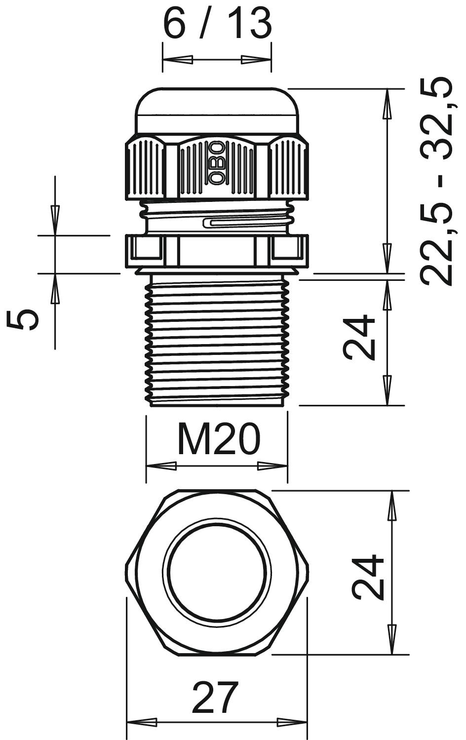 Anti-chocs non Avec contre-écrou non Bague d'étanchéité à usage multiple non Capacité d’étanchéité D max. 13 mm Capacité d’étanchéité D min. 6 mm Cote L1 24 mm Cote L2 5 mm Couleur noir Couple de serrage instable 3,75 Nm Diamètre nominal du filetage 20 Dimension M20 Dimension E 27 mm Dimension L max. 32,5 mm Dimension L min. 22,5 mm Eclateur antidéflagrant non Empreinte CO2 (GWP) du berceau à la porte 0,0561 kg CO2e / 1 Pièce Filetage M20 x 1,5 Indice de protection IP68 Longueur de filetage 24 mm Matériau Polyamide Méplat 24 Modèle droit Pas de filetage 1,8 mm Plage de températures d’utilisation max. 65 °C Plage de températures d’utilisation min. -20 °C Possibilité de décharge de traction oui Pour zone explosive sans Pour zone explosive gaz sans Pour zone explosive poussières sans Presse-étoupe divisible non Presse-étoupe pour câbles plats non Protection antiflexion non Renforcé par fibres de verre non Résistant aux flammes selon la norme VDE 0471/DIN 695 partie 2-1, température de test 650 °C Sans halogène oui Six pans cote sur angulaire 27 mm Type d'étanchéité Bague d'étanchéité Type de filetage métrique - Tous les types