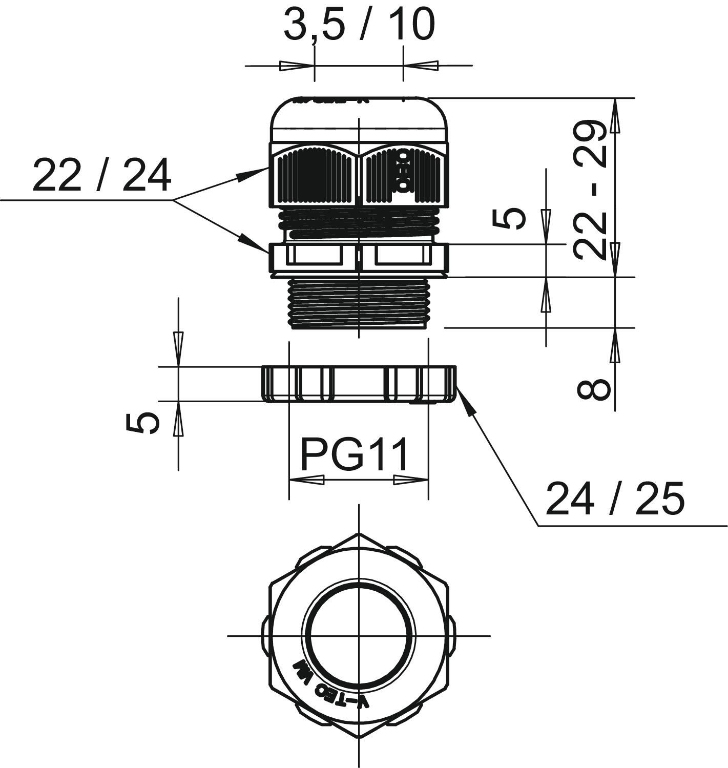 Anti-chocs non Avec contre-écrou oui Bague d'étanchéité à usage multiple non Capacité d’étanchéité D max. 10 mm Capacité d’étanchéité D min. 3,5 mm Cote E1 (mm) 25 mm Cote E2 24 mm Cote L1 8 mm Cote L2 5 mm Cote L3 5 mm Couleur gris clair; RAL 7035 Diamètre nominal du filetage 11 Dimension PG11 Dimension L max. 29 mm Dimension L min. 22 mm Eclateur antidéflagrant non Empreinte CO2 (GWP) du berceau à la porte 0,0509 kg CO2e / 1 Pièce Filetage Pg 11 Indice de protection IP68 Longueur de filetage 8 mm Matériau Polyamide Modèle droit Ouverture de clé 1 22 mm Ouverture de clé 2 24 mm Pas de filetage 1,5 mm Plage de températures d’utilisation max. 65 °C Plage de températures d’utilisation min. -20 °C Possibilité de décharge de traction oui Pour zone explosive sans Pour zone explosive gaz sans Pour zone explosive poussières sans Presse-étoupe divisible non Presse-étoupe pour câbles plats non Protection antiflexion non Renforcé par fibres de verre non Sans halogène oui Six pans cote sur angulaire 25 mm Type d'étanchéité Bague d'étanchéité Type de filetage PG - Tous les types