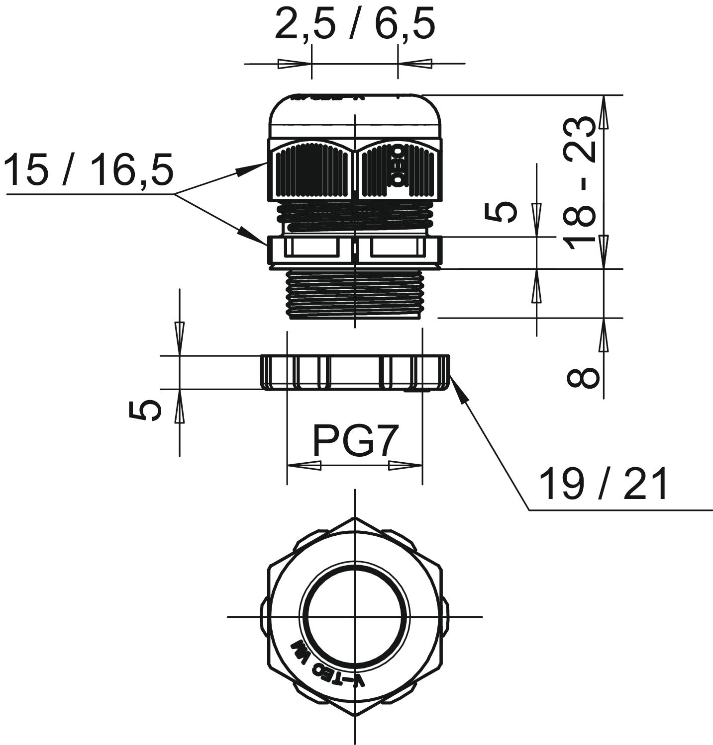 Anti-chocs non Avec contre-écrou oui Bague d'étanchéité à usage multiple non Capacité d’étanchéité D max. 6,5 mm Capacité d’étanchéité D min. 2,5 mm Cote E1 (mm) 16,5 mm Cote E2 21 mm Cote L1 8 mm Cote L2 5 mm Cote L3 5 mm Couleur gris clair; RAL 7035 Diamètre nominal du filetage 7 Dimension PG7 Dimension L max. 23 mm Dimension L min. 18 mm Eclateur antidéflagrant non Empreinte CO2 (GWP) du berceau à la porte 0,03 kg CO2e / 1 Pièce Filetage Pg 7 Indice de protection IP68 Longueur de filetage 8 mm Matériau Polyamide Modèle droit Ouverture de clé 1 15 mm Ouverture de clé 2 19 mm Pas de filetage 1,5 mm Plage de températures d’utilisation max. 65 °C Plage de températures d’utilisation min. -20 °C Possibilité de décharge de traction oui Pour zone explosive sans Pour zone explosive gaz sans Pour zone explosive poussières sans Presse-étoupe divisible non Presse-étoupe pour câbles plats non Protection antiflexion non Renforcé par fibres de verre non Sans halogène oui Six pans cote sur angulaire 16,5 mm Type d'étanchéité Bague d'étanchéité Type de filetage PG - Tous les types