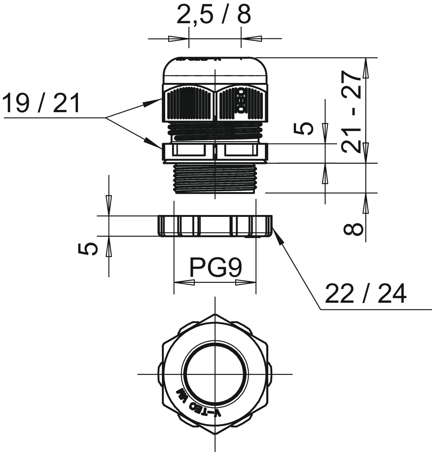 Anti-chocs non Avec contre-écrou oui Bague d'étanchéité à usage multiple non Capacité d’étanchéité D max. 8 mm Capacité d’étanchéité D min. 2,5 mm Cote E1 (mm) 24 mm Cote E2 21 mm Cote L1 8 mm Cote L2 5 mm Cote L3 5 mm Couleur gris clair; RAL 7035 Diamètre nominal du filetage 9 Dimension PG9 Dimension L max. 27 mm Dimension L min. 21 mm Eclateur antidéflagrant non Empreinte CO2 (GWP) du berceau à la porte 0,0421 kg CO2e / 1 Pièce Filetage Pg 9 Indice de protection IP68 Longueur de filetage 8 mm Matériau Polyamide Modèle droit Ouverture de clé 1 19 mm Ouverture de clé 2 22 mm Pas de filetage 1,5 mm Plage de températures d’utilisation max. 65 °C Plage de températures d’utilisation min. -20 °C Possibilité de décharge de traction oui Pour zone explosive sans Pour zone explosive gaz sans Pour zone explosive poussières sans Presse-étoupe divisible non Presse-étoupe pour câbles plats non Protection antiflexion non Renforcé par fibres de verre non Sans halogène oui Six pans cote sur angulaire 21 mm Type d'étanchéité Bague d'étanchéité Type de filetage PG - Tous les types