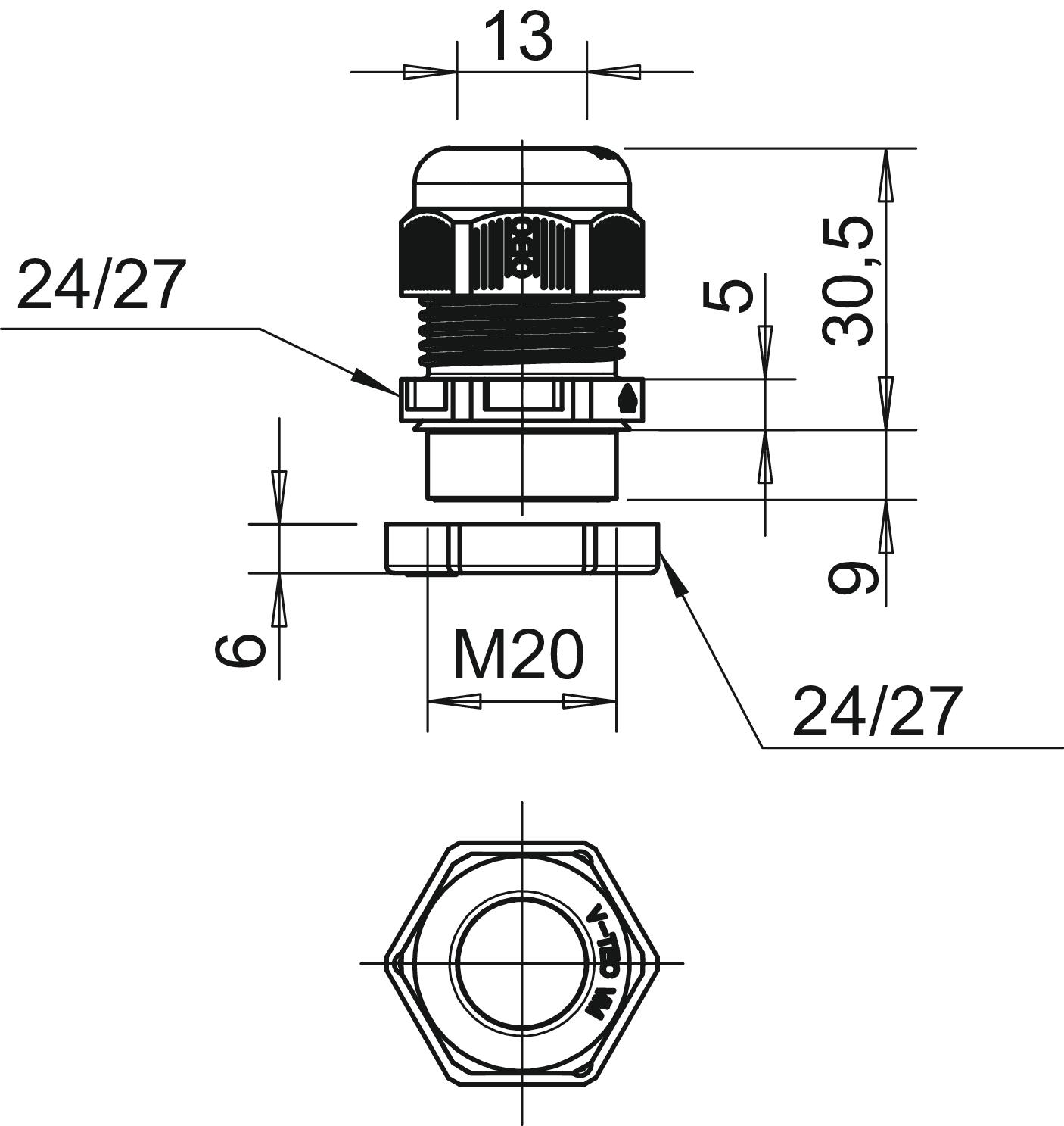 Anti-chocs non Avec contre-écrou oui Bague d'étanchéité à usage multiple non Capacité d’étanchéité D max. 13 mm Capacité d’étanchéité D min. 6 mm Cote E1 (mm) 27 mm Cote E2 27 mm Cote L1 9 mm Cote L2 5 mm Cote L3 6 mm Couleur orangé pastel ; RAL 2003 Couple de serrage instable 3,8 Nm Dimension M20 Dimension E 27 mm Dimension G M20 x 1,5 mm Dimension L max. 30,5 mm Dimension L min. 23,5 mm Empreinte CO2 (GWP) du berceau à la porte 0,0553 kg CO2e / 1 Pièce Filetage M20 x 1,5 Indice de protection IP68 Longueur de filetage 9 mm Matériau Polyamide Méplat 24 Ouverture de clé 1 24 mm Ouverture de clé 2 24 mm Pas de filetage 1,5 mm Plage de températures d’utilisation max. 65 °C Plage de températures d’utilisation min. -20 °C Possibilité de décharge de traction oui Pour zone explosive sans Pour zone explosive gaz sans Pour zone explosive poussières sans Presse-étoupe divisible non Presse-étoupe pour câbles plats non Protection antiflexion non Renforcé par fibres de verre non Résistant aux flammes selon la norme VDE 0471/DIN 695 partie 2-1, température de test 650 °C Sans halogène oui Type de filetage métrique - Tous les types