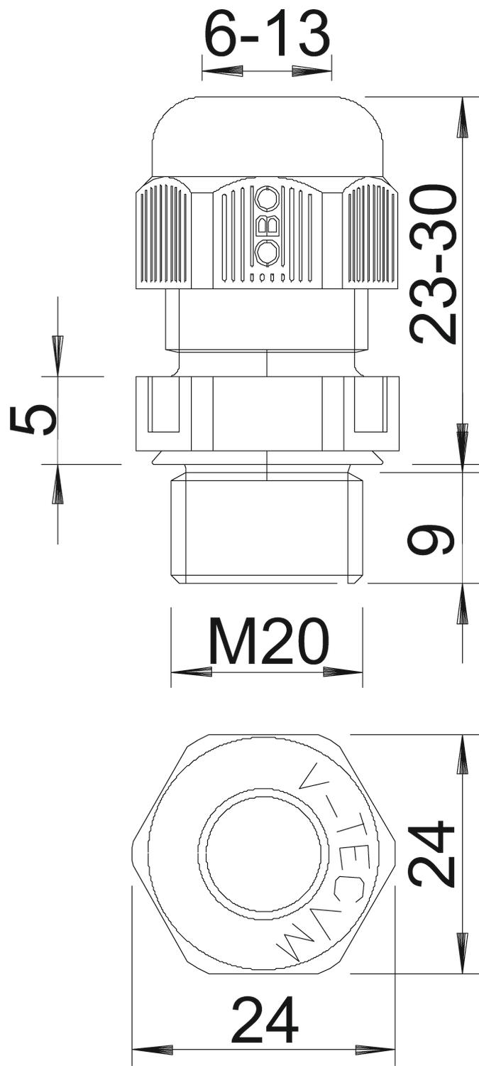 Anti-chocs non Avec contre-écrou non Bague d'étanchéité à usage multiple non Capacité d’étanchéité D max. 13 mm Capacité d’étanchéité D min. 6 mm Cote L1 9 mm Cote L2 5 mm Couleur blanc pur; RAL 9010 Couple de serrage instable 3,8 Nm Diamètre nominal du filetage 20 Dimension M20 Dimension L max. 30,5 mm Dimension L min. 23,5 mm Eclateur antidéflagrant non Empreinte CO2 (GWP) du berceau à la porte 0,0426 kg CO2e / 1 Pièce Filetage M20 x 1,5 Indice de protection IP68 Longueur de filetage 9 mm Matériau Polyamide Méplat 24 Modèle droit Pas de filetage 1,5 mm Plage de températures d’utilisation max. 65 °C Plage de températures d’utilisation min. -20 °C Possibilité de décharge de traction oui Pour zone explosive sans Pour zone explosive gaz sans Pour zone explosive poussières sans Presse-étoupe divisible non Presse-étoupe pour câbles plats non Protection antiflexion non Renforcé par fibres de verre non Résistant aux flammes selon la norme VDE 0471/DIN 695 partie 2-1, température de test 650 °C Sans halogène oui Type d'étanchéité Bague d'étanchéité Type de filetage métrique - Tous les types