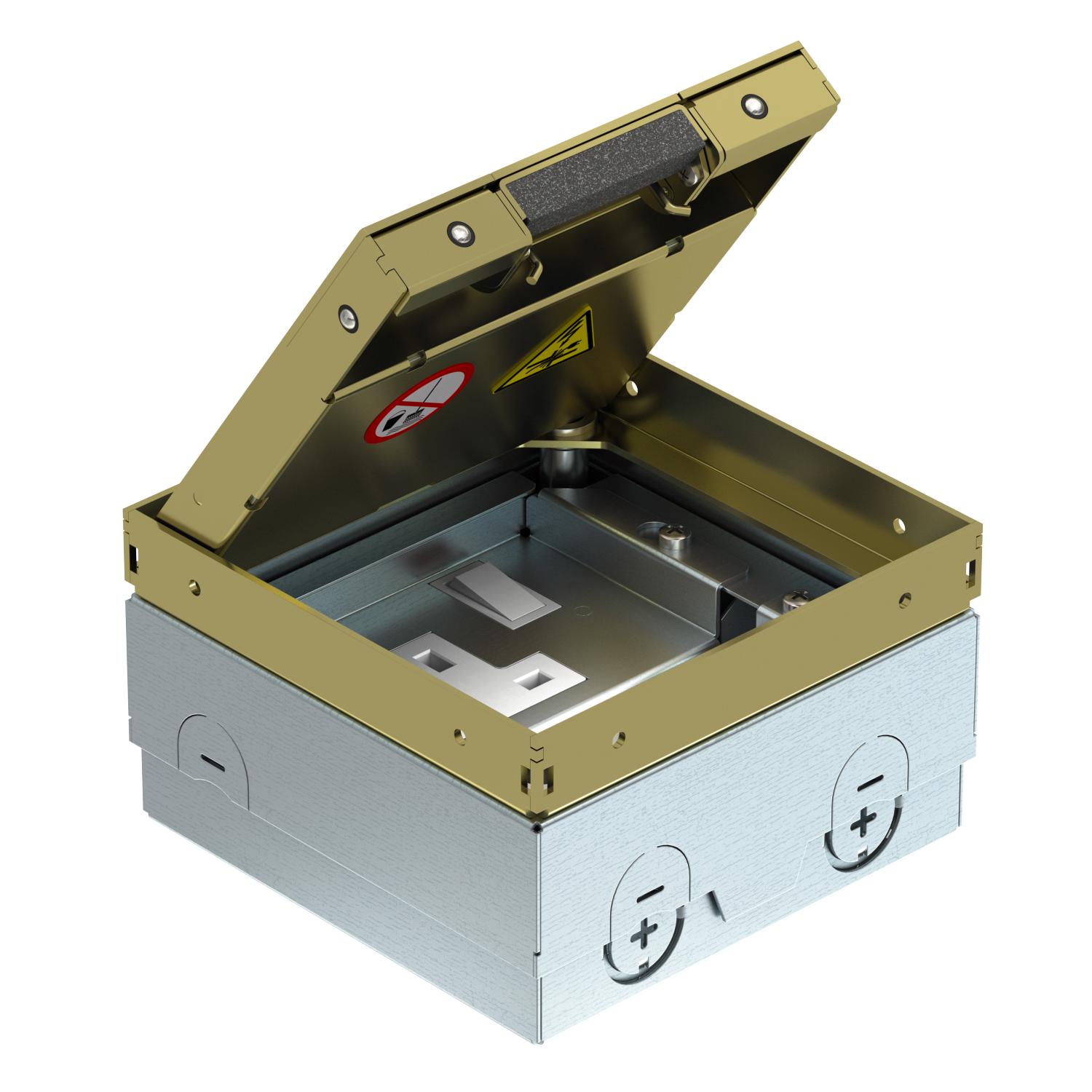 Description du produitBoîtier de sol carré pour une utilisation dans des planchers et des chapes nettoyés à sec, utilisation en intérieur. Boîtier de montage avec ouvertures d’insertion prédécoupées pour tubes (M20/M25). Couvercle réglable à l’aide de 4 supports de nivellement sur le rebord supérieur du revêtement de sol. La profondeur d'encastrement minimale est de 85 mm, la plage de nivellement + 20 mm. Cadre et couvercle en laiton visibles dans le revêtement de sol. Couvercle évidé pour l'insertion du revêtement de sol. La capacité de charge de 15 kN n’est autorisée qu’en cas de non utilisation. Une prise de courant BS commutée et un support informatique pour 2 prises de données femelles LJU6C sont fournis à la livraison.