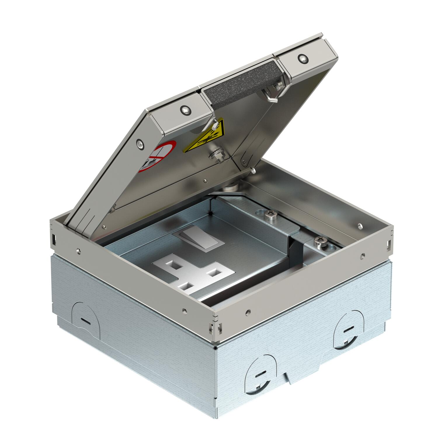 Description du produitBoîtier de sol carré pour une utilisation dans des planchers et des chapes nettoyés à sec, utilisation en intérieur. Boîtier de montage avec ouvertures d’insertion prédécoupées pour tubes (M20/M25). Couvercle réglable à l’aide de 4 supports de nivellement sur le rebord supérieur du revêtement de sol. La profondeur d'encastrement minimale est de 75 mm, la plage de nivellement + 30 mm. Cadre et couvercle en acier inoxydable visibles dans le revêtement de sol. Couvercle avec plaque décorative. La capacité de charge de 15 kN n’est autorisée qu’en cas de non utilisation. Une prise de courant BS commutée et un support informatique pour 2 prises de données femelles LJU6C sont fournis à la livraison.