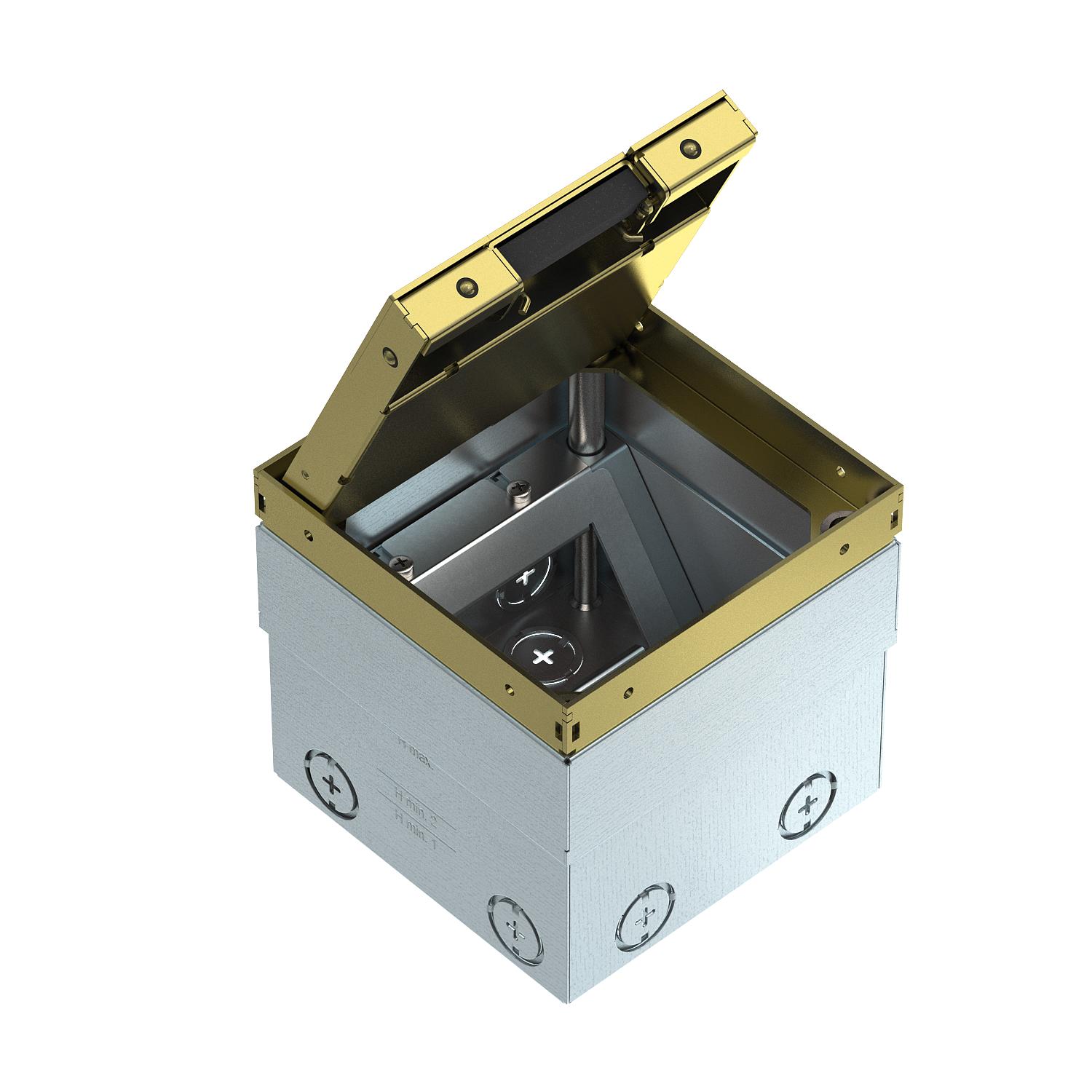 Cadre et couvercle en laiton non masqués dans le revêtement de sol. Boîtier vide pour jusqu’à 2 appareillages encastrables Modul°45® dans le support de montage et 2 prises informatiques femelles dans des supports informatiques en option. La capacité de charge de 15 kN n’est autorisée qu’en cas de non utilisation.