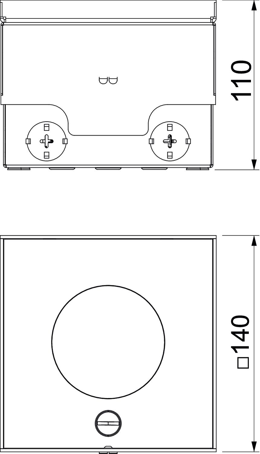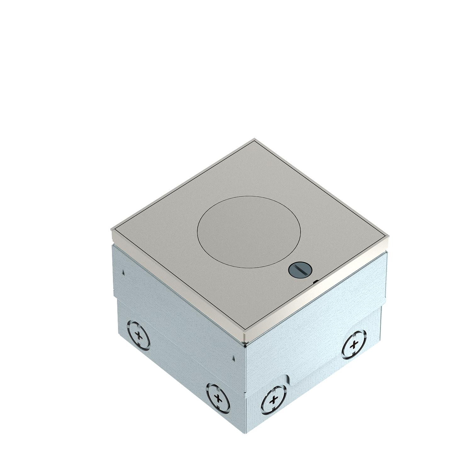 Description du produitBoîtier de sol carré pour une utilisation dans des planchers creux et des chapes nettoyés à sec ou à l’eau. Boîtier d’encastrement avec pré-poinçonnage des ouvertures pour tuyaux (M25). Couvercle réglable à l’aide de 4 supports de nivellement sur le rebord supérieur du revêtement de sol. La profondeur d'encastrement minimale est de 110 mm, la plage de nivellement + 25 mm.