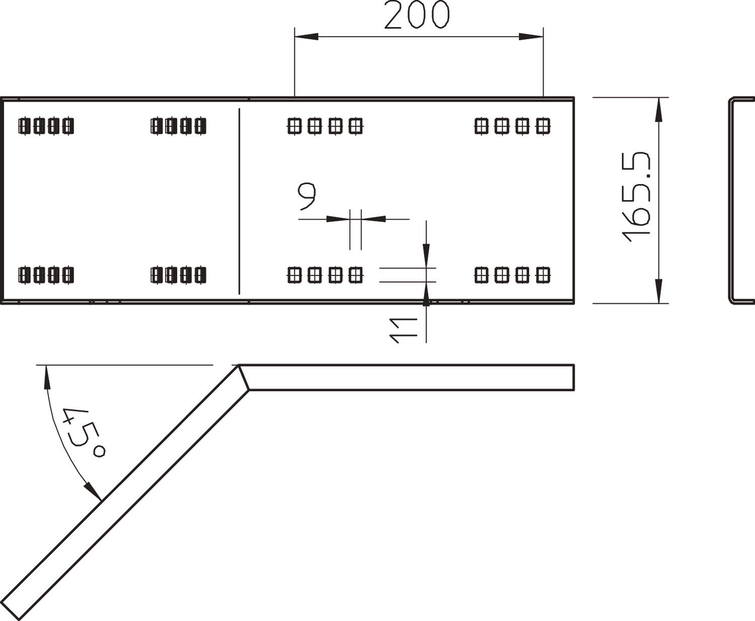 Description du produitÉclisse d'angle à 45°, horizontale, pour chemins de câbles et échelles à câbles longue portée d'une hauteur d'aile de 160 mm.