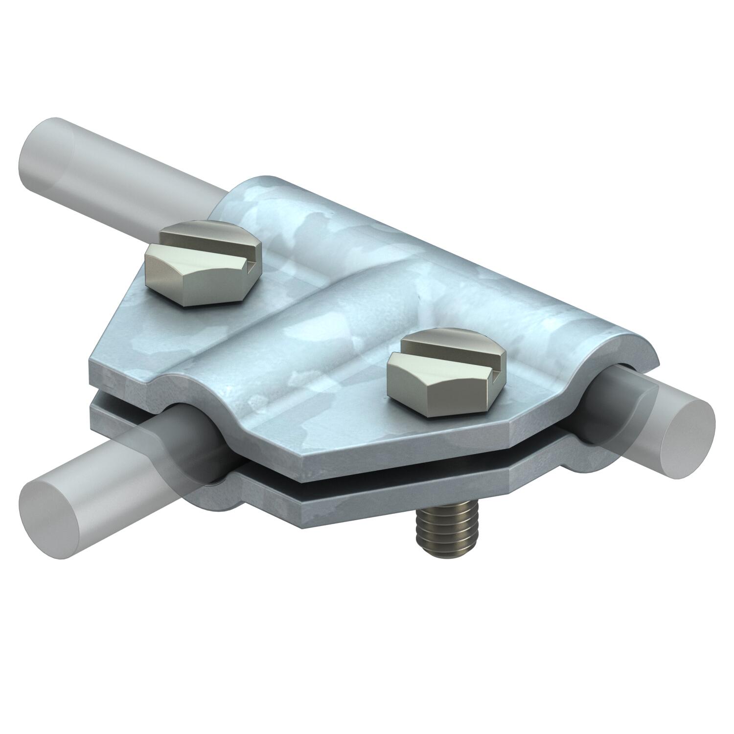 Ajustement Rd 8-10 mm Capacité d’écoulement d’intensité de foudre N/50 kA Convient pour le raccordement Conducteur rond Rd 8-10 / Rd 8-10 Dimension 8-10mm Empreinte CO2 (GWP) du berceau à la porte 0,2506 kg CO2e / 1 Pièce Matériau Acier Plaque intermédiaire non Surface galvanisé à chaud par trempage Type de raccord Raccord en Té Type de vis de fixation Vis à tête hexagonale - Tous les types