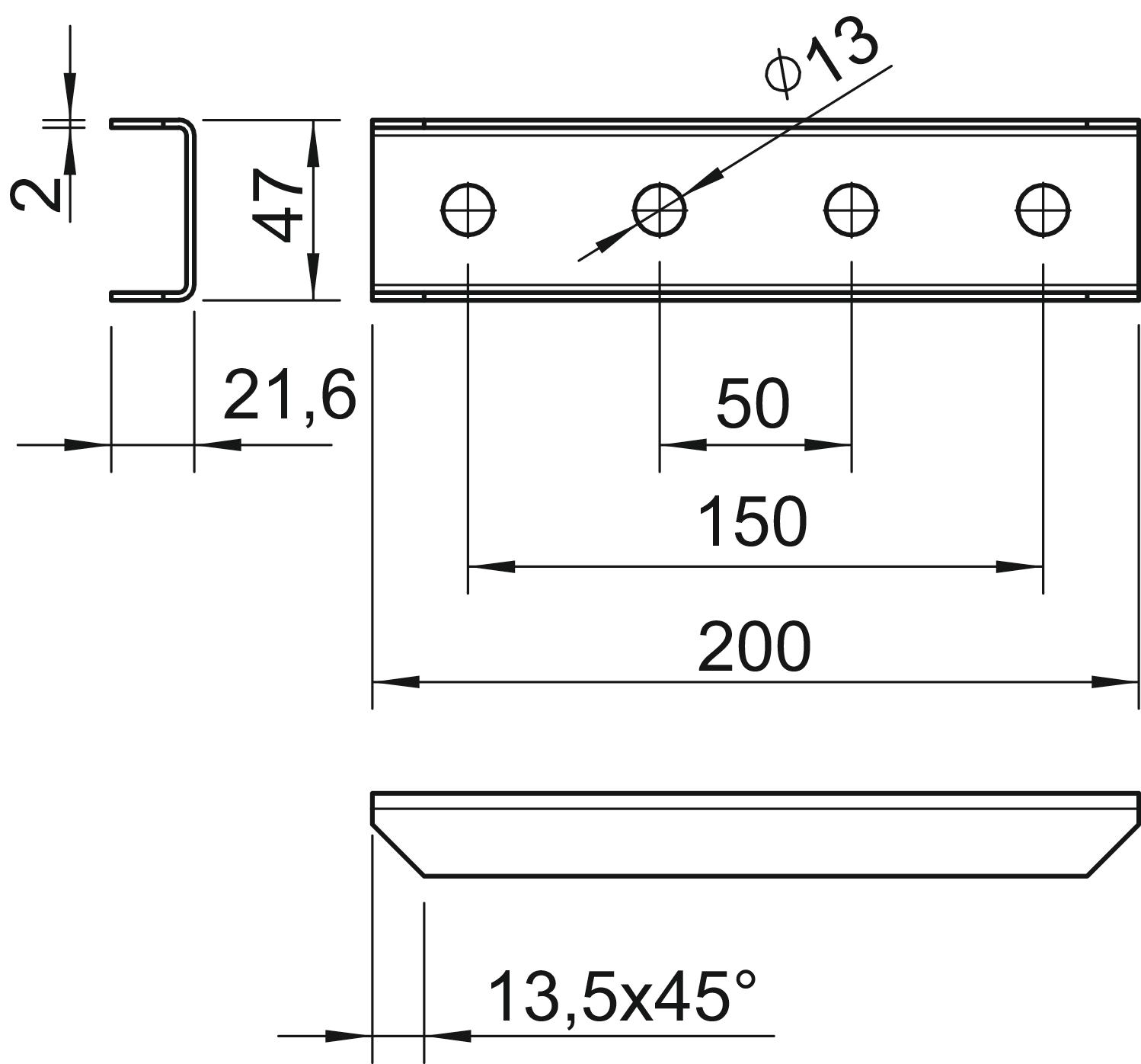 Acier inoxydable, teint non Avec accessoires pour vis non Convient pour formes de profilé Profilé en C Dimension 200x48x30 Dimension du trou 13 mm Empreinte CO2 (GWP) du berceau à la porte 0,6485 kg CO2e / 1 Pièce Épaisseur du matériau 2 mm Hauteur 22 mm Largeur 47 mm Longueur 200 mm Matériau Acier Modèle avec perçage traversant 13 mm Surface galvanisé à chaud par trempage - Tous les types