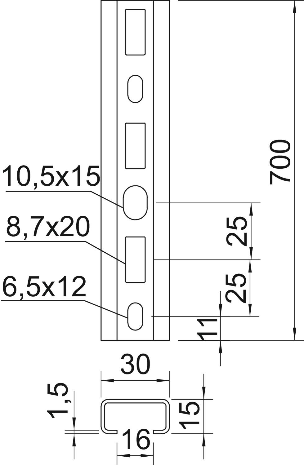 Description du produitRail profilé, perforé, ouverture 16 mm.
