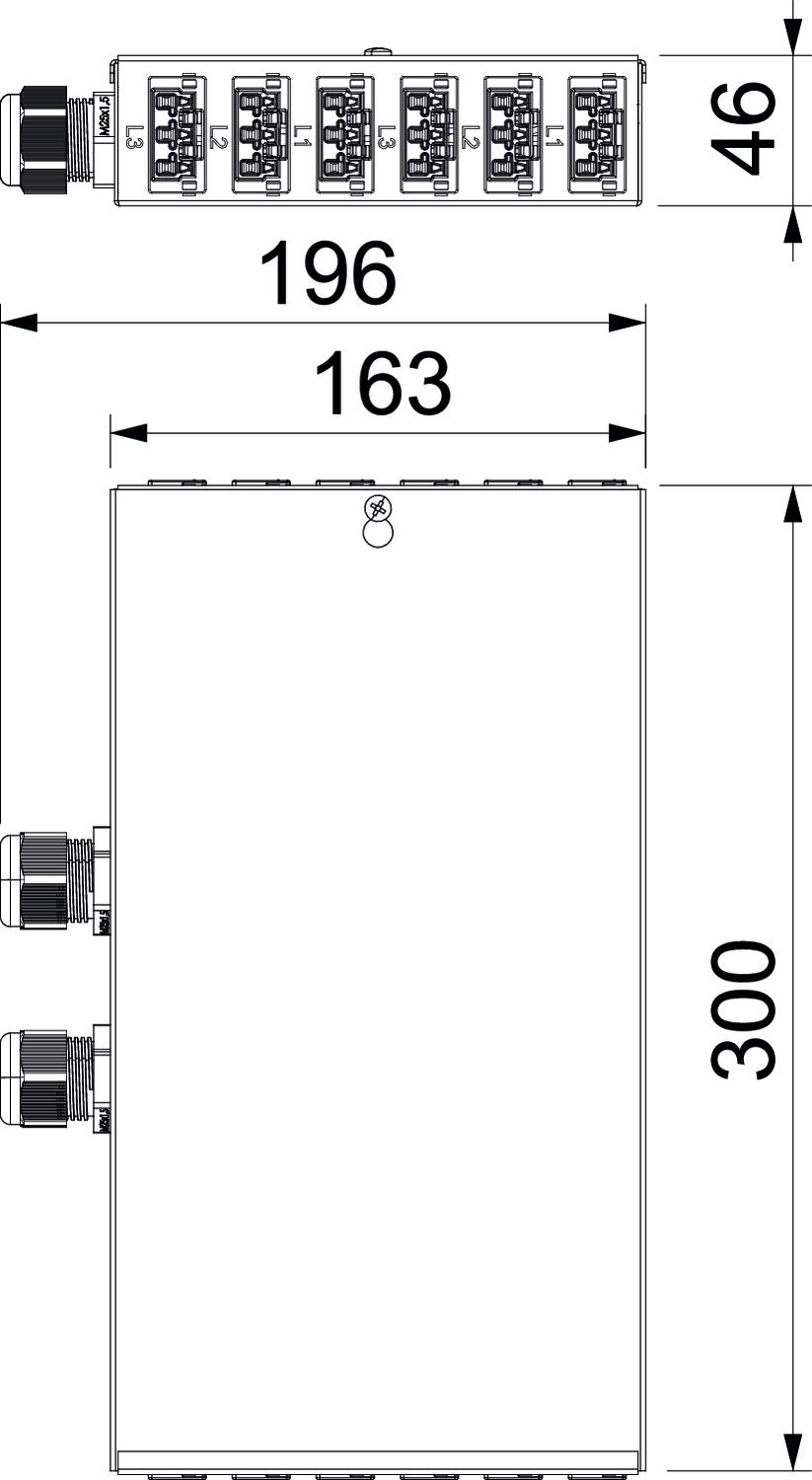 Couleur du système de connecteurs noir/blanc Dimension 300x196x46 Empreinte CO2 (GWP) du berceau à la porte 4,134 kg CO2e / 1 Pièce Entrée 5 pôles Hauteur 46 mm Largeur 163 mm Longueur 300 mm Matériau Acier Nombre de circuits d'entrée 2 nombre prises 12 Section du câble de raccordement 4 mm² Système de connecteur à fiche lié au système oui Type de raccordement Borne - Tous les types