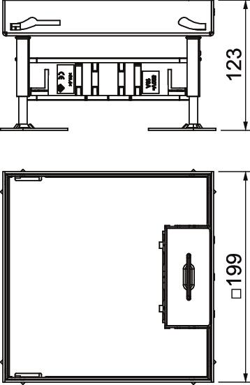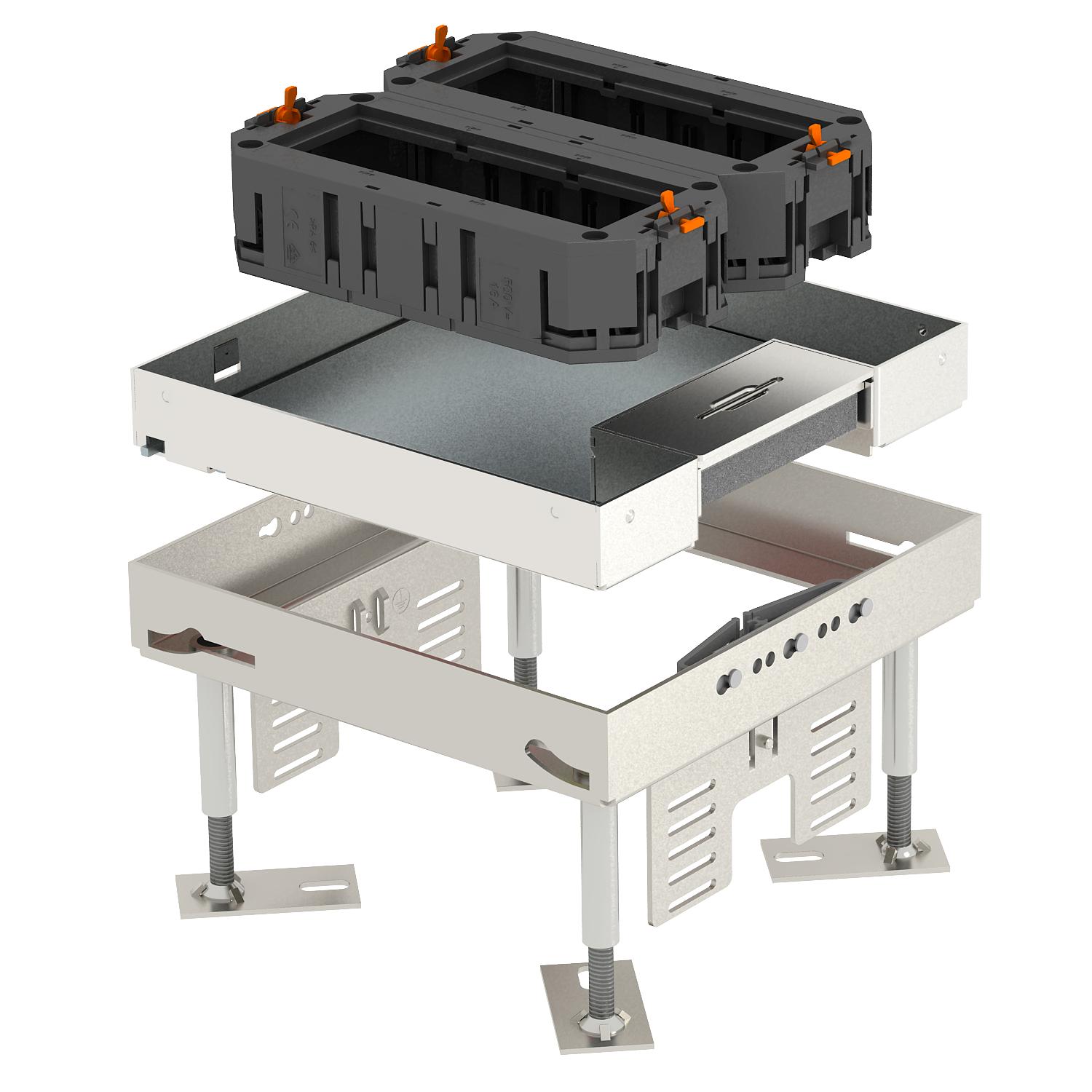 - deux supports universels UT3/45 pour trois appareillages encastrables Modul 45® chacun. Cassette et sortie de cordon en acier inoxydable. Évidement pour l'insertion du revêtement de sol dans la cassette 25 mm.