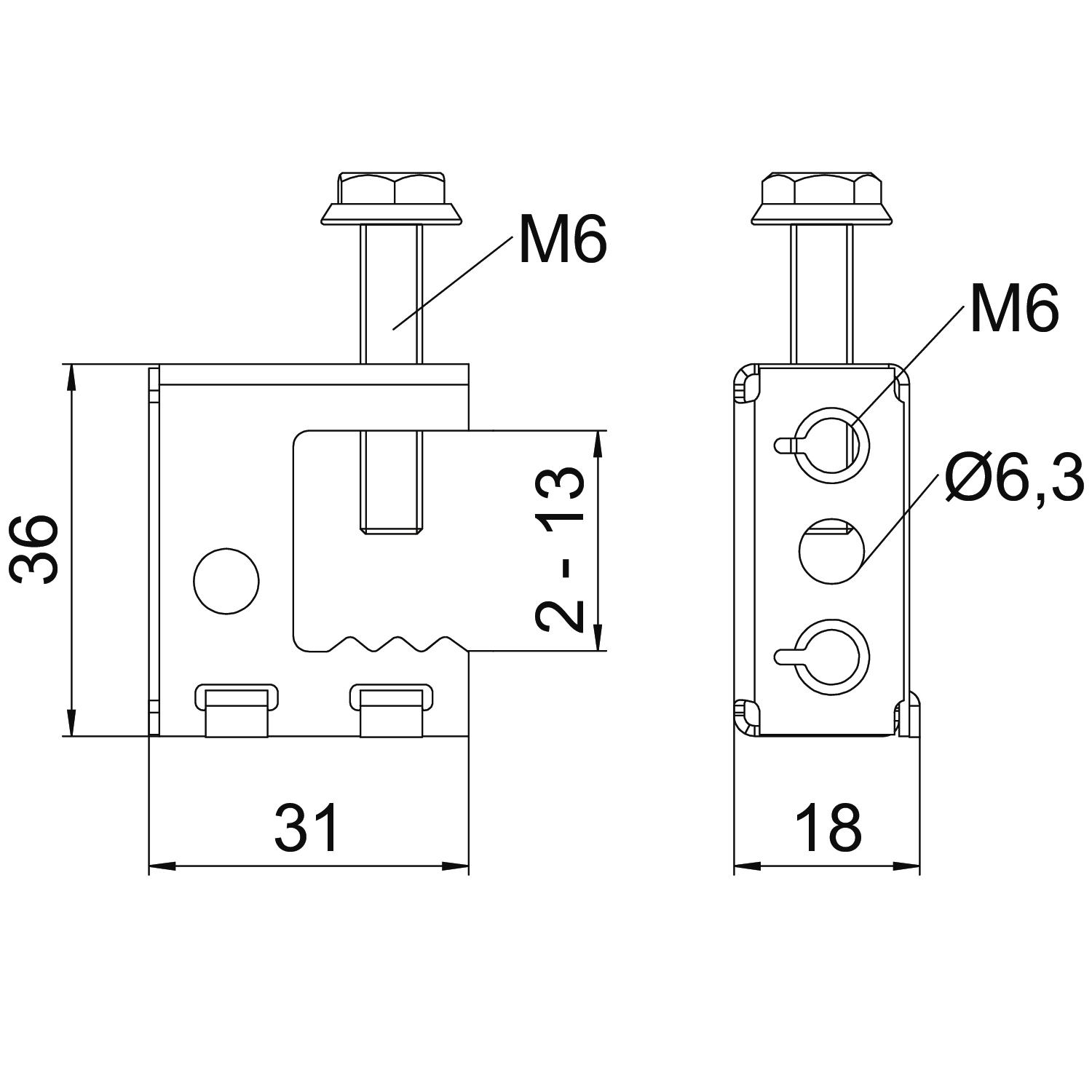 À charnière non Charge de rupture 0,55 kN Charnière ajustable non Couleur zinc Dimension 2-13mm Épaisseur de bride F max. 16 mm Épaisseur de bride F min. 2 mm Filetage M6 Filetage, métrique 6 Hauteur 36 mm Largeur 18 mm Longueur 31 mm Matériau Acier Surface Lamelle de zinc Type de fixation visser Type/élément de raccordement autres - Tous les types