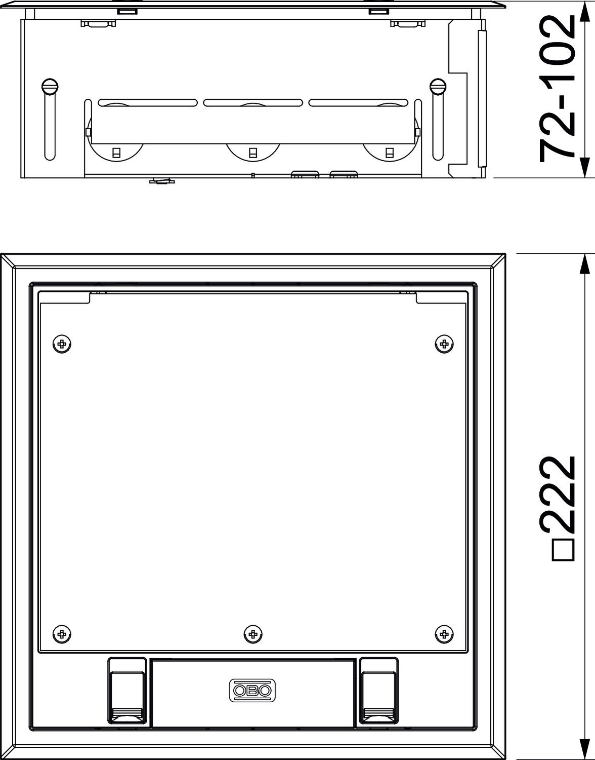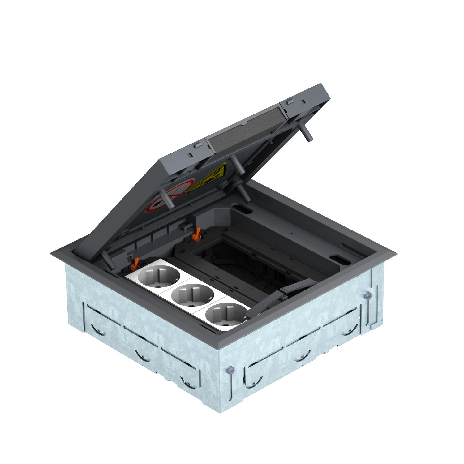 Description du produitUnité de montage carrée pour six appareils Modul 45, destinée à être utilisée dans des planchers creux et chapes nettoyés à sec en intérieur, comprenant un boîtier de montage, un boîtier de sol GES4-2, deux supports universels UT et une prise de courant triple à contact de protection de 33°, en blanc. Boîtier de montage avec ouvertures d'insertion prédécoupées pour tubes d'installation (M25), réglage sur le rebord supérieur de la chape. Le boîtier de montage est livré fermé avec un couvercle plein. L'unité de montage d'appareillages avec boîtier de sol peut être inséré dans l'ouverture d'installation résultante après les travaux de chape. Évidement dans le couvercle rabattable du boîtier de sol 3, 5, 8 ou 10 mm.