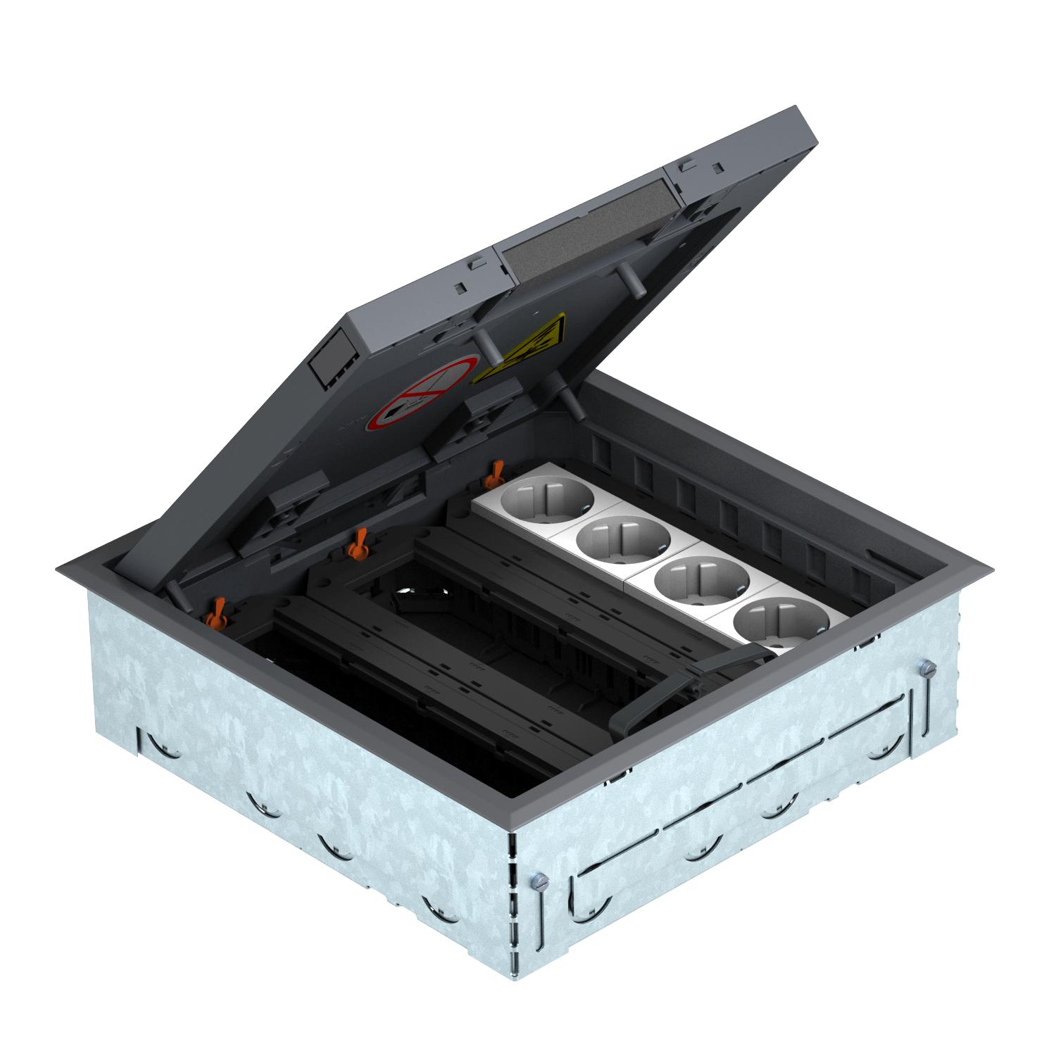Description du produitUnité de montage carrée pour douze appareils Modul 45, destinée à être utilisée dans des planchers creux et chapes nettoyés à sec en intérieur, comprenant un boîtier de montage, un boîtier de sol GES9-2, trois supports universels UT et deux prises de courant doubles à contact de protection de 33°, en blanc. Boîtier de montage avec ouvertures d'insertion prédécoupées pour tubes d'installation (M25), réglage sur le rebord supérieur de la chape. Le boîtier de montage est livré fermé avec un couvercle plein. L'unité de montage d'appareillages avec boîtier de sol peut être inséré dans l'ouverture d'installation résultante après les travaux de chape. Évidement dans le couvercle rabattable du boîtier de sol 3, 5, 8 ou 10 mm. La profondeur minimale d’encastrement est de 73 mm, y compris le revêtement de sol, et la plage de nivellement + 30 mm.